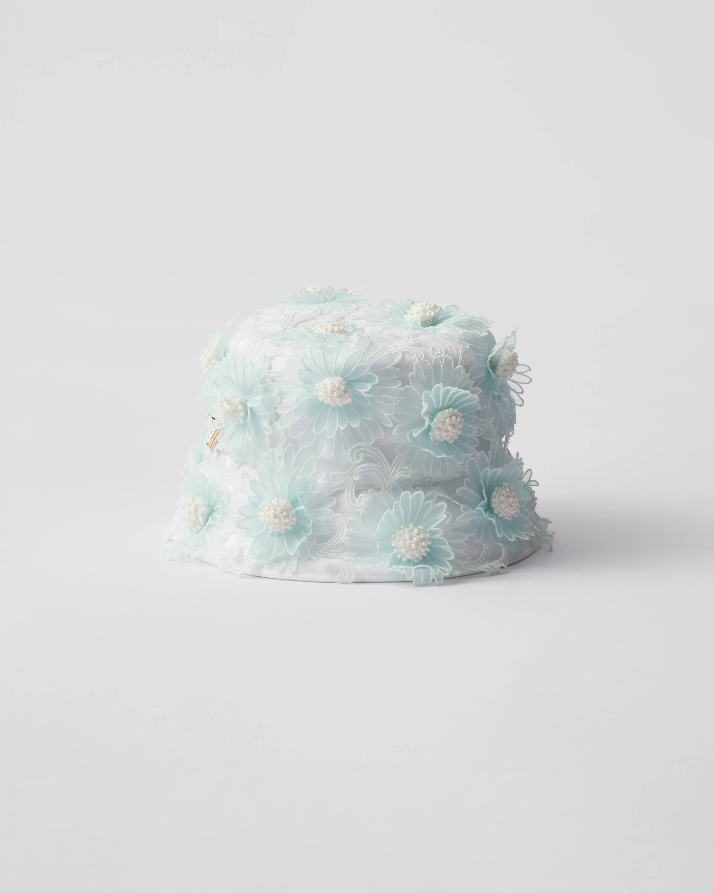 The iconic bucket hat is reimagined with intricate guipure lace embroidery. The enameled metal triangle logo adds a touch of modern sophistication. This product does not contribute to the SEA BEYOND educational program. - Product code: 1HC137_16BY_F064W - Enameled metal triangle logo - Cotton lining - Imported MATERIALS Main material: Cotton polyester silk aluminum