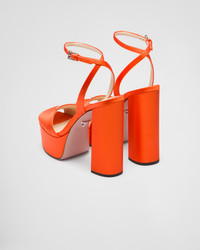 These high-heeled satin platform sandals have a contemporary design with sophisticated allure. The nuances of the fabric add a brilliant tone to the shoe decorated with the iconic enameled metal triangle logo which first appeared in 1913 on trunks designed by Mario Prada. - Product code: 1XP48B_049_F0049_F_135 - Upper with logo-engraved metal buckle - Enameled metal triangle logo - Leather and rubber sole with metal lettering logo - 135 mm satin-covered heel - 40 mm satin-covered platform - Imported MATERIALS Fabric