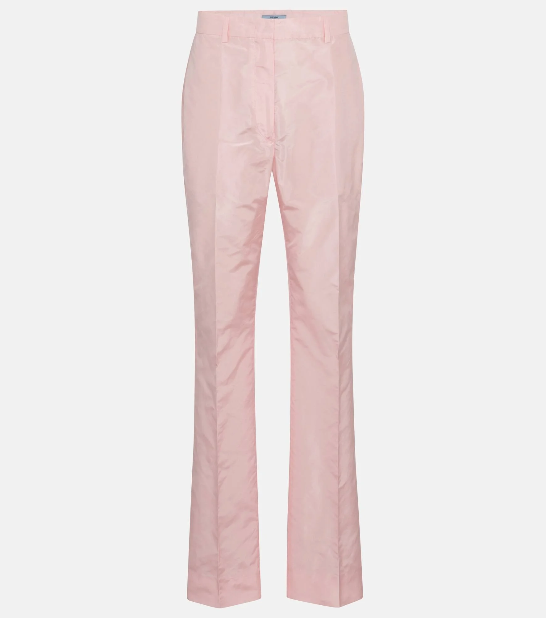 Prada alludes to this season's pastel palette with these pale pink straight-leg pants. From Raf Simon's Spring/Summer '21 runway debut, the high-rise pair is made from silk taffeta for a lustrous sheen, with pressed pleats and concealed fastenings that make for clean-profiled tailoring. Accentuate the subtle triangle belt loop with the coordinating slingback pumps. Product Details - Pocket lining: 100% cupro - Closure: zipper fly, button and hook fastenings - Belt loops - Designer color name: Ciliegio - Made in Italy - Pockets: side slit pockets, back pockets - Material: 100% silk - Care instructions: dry clean - Item number: P00539940 Size & Fit - Fits large to size - we recommend trying one size smaller - Straight leg - High-waisted - The model seen in the picture is 178cm-5'10" and wearing a size IT 38