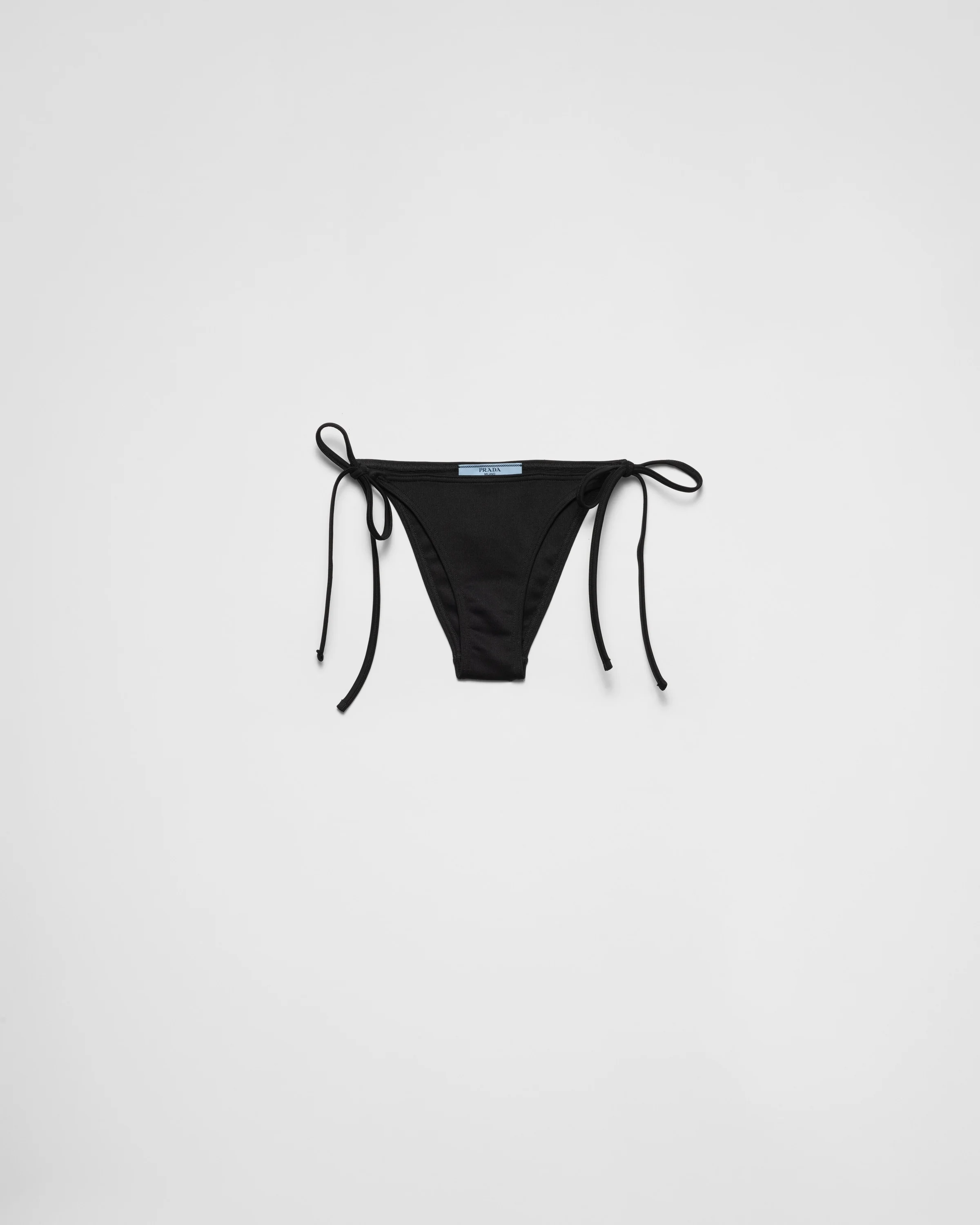 This low-rise bikini bottom with a sleek, contemporary design is completed with side ties. The enameled metal triangle logo enhances the style, giving it an iconic note. - Product code: 70212_13SV_F0002_S_231 - Low-rise waist - Tie side closure - Enameled metal triangle logo - Imported - The model is 177 cm tall and wears a size 38 MATERIALS Main material: 10% elastane 90% recycled polyester