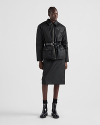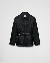 The pragmatic elegance of this down jacket is an expression of Prada's dual aesthetic constructed with subtle contrasts and original details. The style made of Re-Nylon is embellished with a leather belt that defines the silhouette, emphasizing its soft volumes. For sustainable care to preserve the product's characteristics and reduce microfiber shedding, we recommend not washing the item too often. Let the product air out after every use and have it dry cleaned at a specialized ecological dry cleaners. - Product code: 292200_1WQ8_F0002_S_OOO - Goose down padding - Shirt-style collar - Long sleeves - Straight cuff - Zipper closure - Enameled metal triangle logo - Flapped patch pocket with button - Leather belt with metal buckle - Comfortable regular fit, the garment fits up to one size larger - Imported - The model is 178 cm tall and wears a size 38 Height: 70cm MATERIALS Main material: 100% recycled polyamide