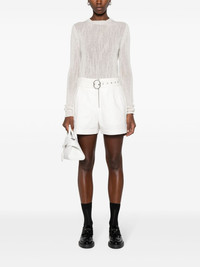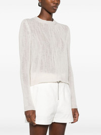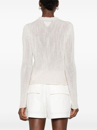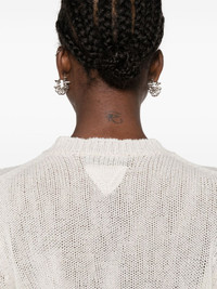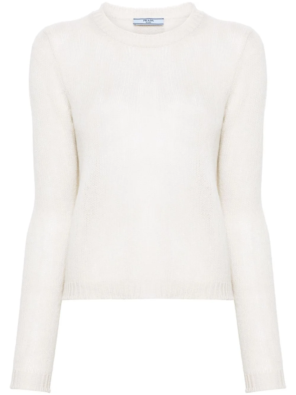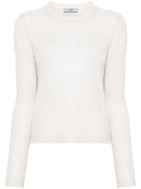 crew-neck cashmere jumper Prada adopts a minimalist approach with this chalk-white jumper. It's knitted from cashmere in a timeless crew-neck silhouette and adorned with a tonal triangle logo on the back. Highlights - Chalk white - Cashmere - Knitted construction - Ribbed trim - Crew neck - Long sleeves - Straight hem Composition Cashmere 100% SIZE & FIT Model measurements Height 5 ft 10 in(1.78 m) Bust/Chest 31.49 in(80 cm) Hips 37 in(94 cm) Waist 23.62 in(60 cm) FittingInformation Designed for a relaxed fit, this piece allows for comfort and movement when worn Made with a midweight knit, this piece offers some stretch This piece fits true to size – take your usual size Washing instructions Dry Clean Only
