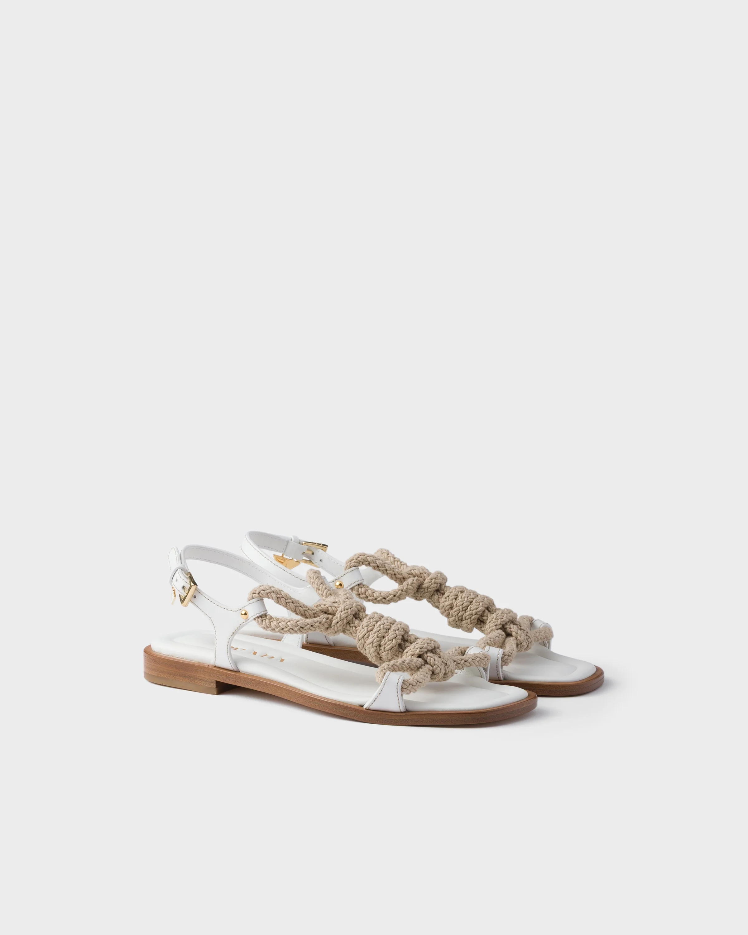 Unexpected notes inspired by nautical style codes give these flat leather sandals distinctive style. The square toe silhouette features a knotted cord detail that enriches the upper with sleek lines. - Product code: 1X994N_248_F0009_F_010 - Upper with cord detail and strap with logo-engraved metal buckle - Enameled metal triangle logo - Monoblock leather sole, 10 mm, with hot-stamped logo - Imported MATERIALS Main material: Calfskin