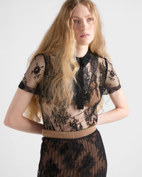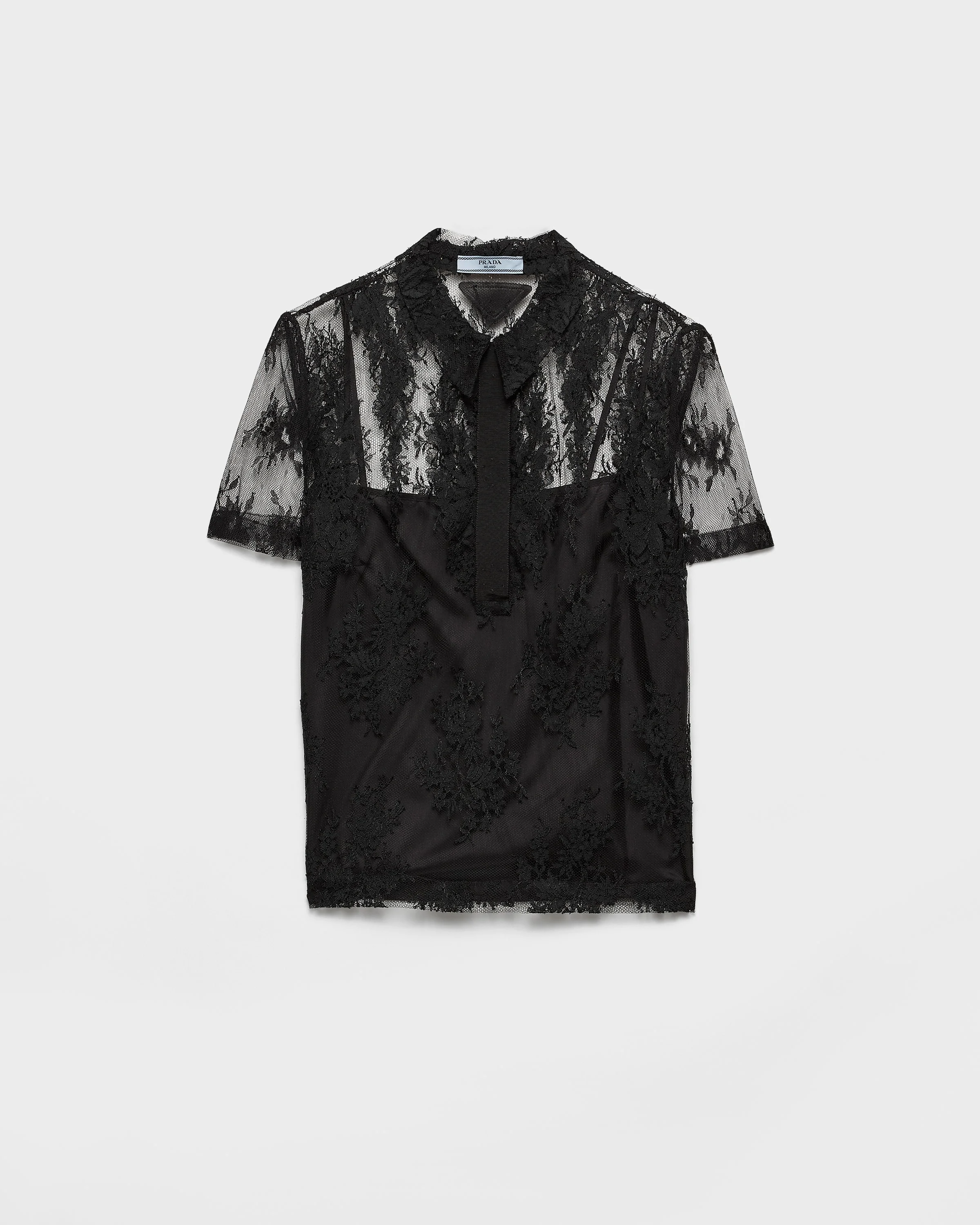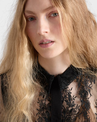 Lace frees itself from any predictable romanticism and is combined with clean volumes and a shirt collar. The top, complete with camisole, reinterprets feminine codes with a consciously modern perspective. - Product code: P936N_17VM_F0002_S_OOO - Straight fit - With camisole - Shirt collar - Front button closure - Short sleeves - Fabric triangle logo - Imported - The model is 180 cm tall and wears a size 38 Height: 55cm MATERIALS Main material: 35% cotton 35% polyamide 30% viscose