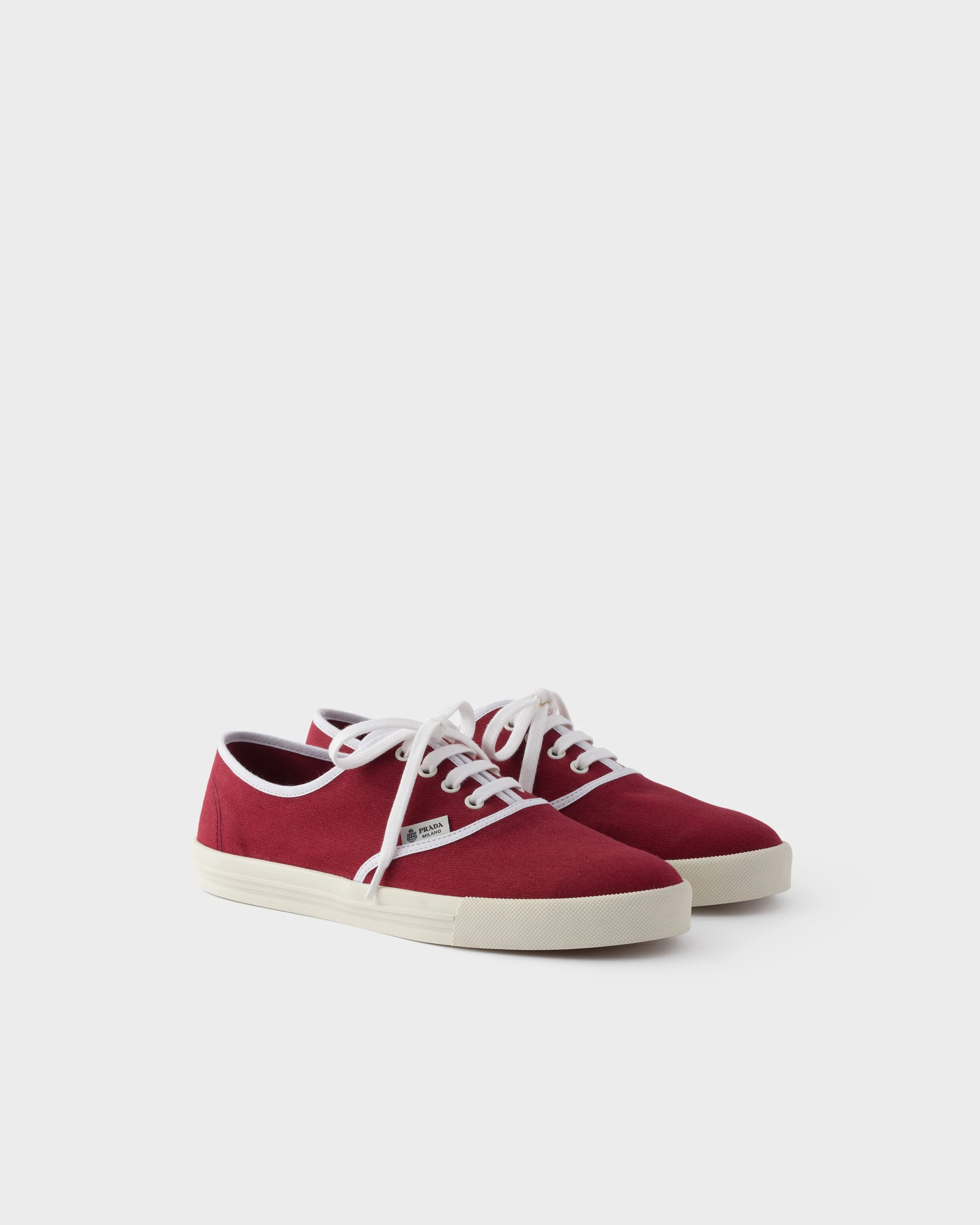 Lightweight fabric with trim in a contrasting shade characterizes these shoes for the new summer season. The distinctive, minimalist logo expresses authenticity and connection, embodying the harmonious strength of Prada elegance. - Product code: 1E402O_3LKE_F0007_F_030 - Upper with contrasting fabric trim - Fabric lining - Fabric logo label - Cotton laces - Rubber sole, 30 mm - Geometric tread - Removable fabric-covered insole - Imported MATERIALS Main material: Cotton