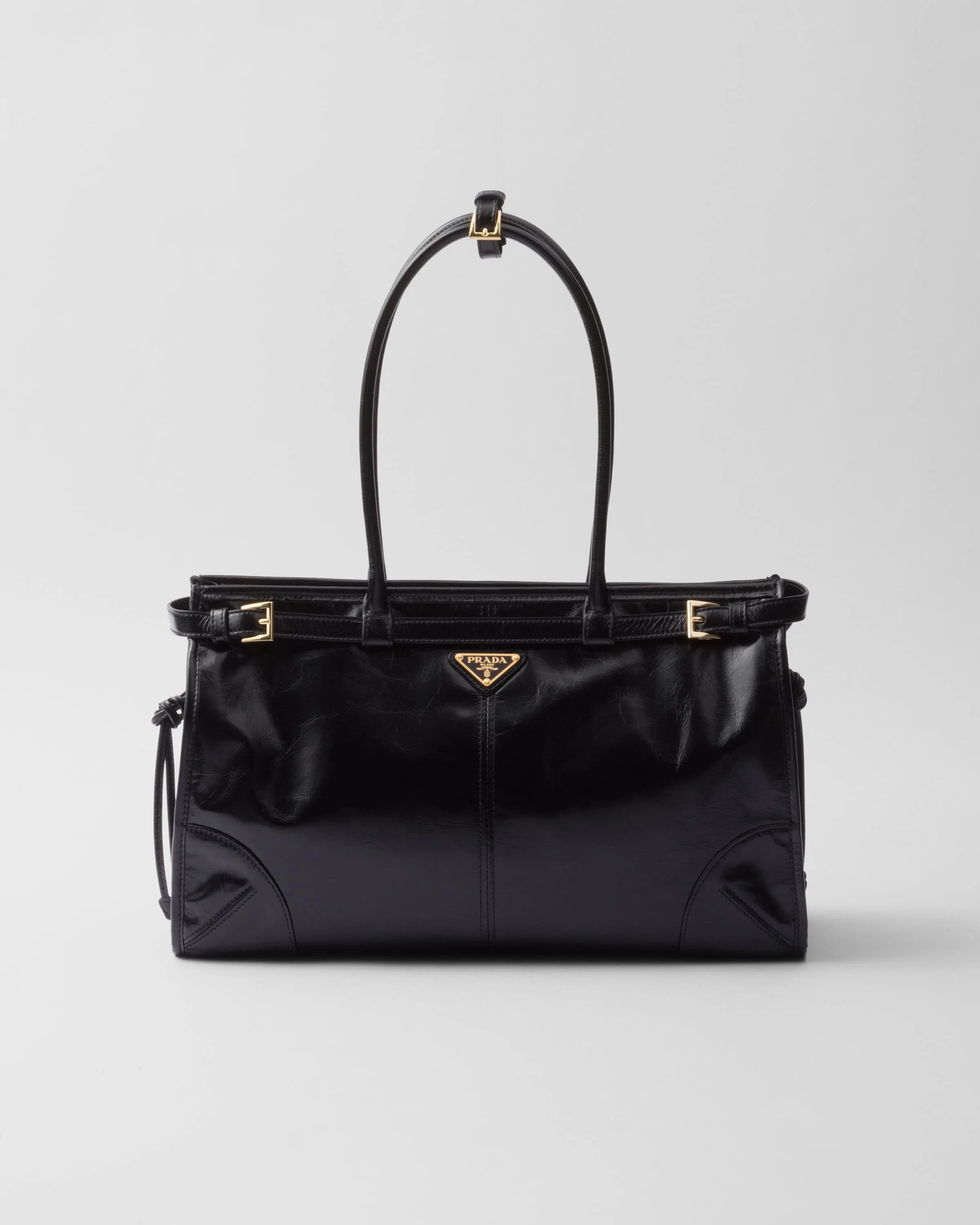 This pragmatic and refined handbag is made of soft leather with a glossy finish that emphasizes its versatile, modern allure. The geometric design blends different influences into one style with a distinctive but sleek aesthetic. Embellished by the sophisticated strap detail, the rectangular silhouette has a roomy interior with zipper pockets. The enameled metal triangle logo completes the look with its iconic signature. - Product code: 1BA433_2CYR_F0002_V_MOO - Leather handles, 22 cm drop - Detachable, adjustable shoulder strap Maximum length 120 cm - Minimum length 100 cm - Maximum drop 60 cm- Minimum drop 50 cm - Metal hardware - Enameled metal triangle logo on the front - Zipper closure - Nappa and logo-print nylon interior with zipper patch pocket - Imported Height: 24cm Width: 38cm Length: 12cm MATERIALS Main material: Calfskin
