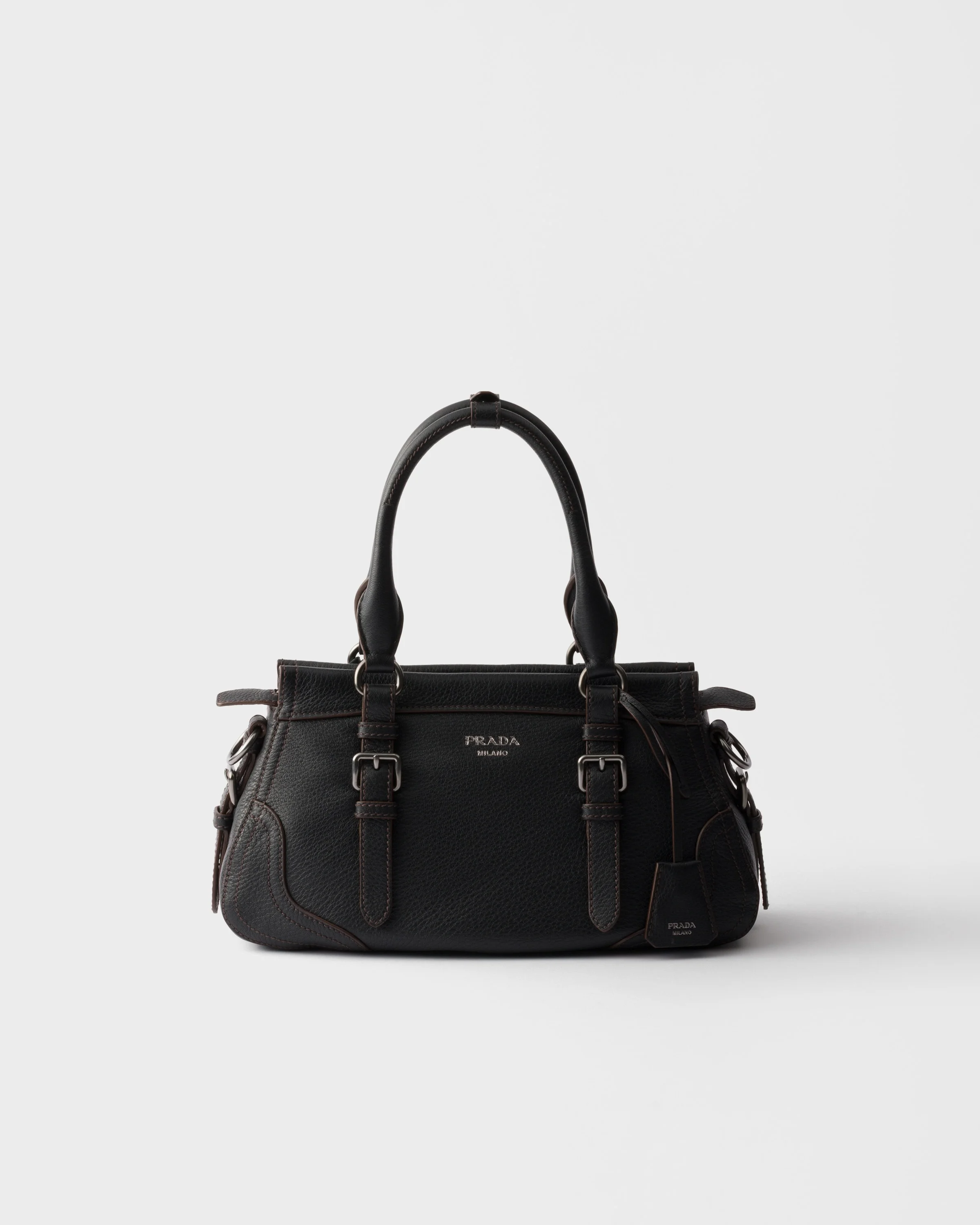 In harmony between past and present, this bag marks a return to the roots of the Prada DNA with a design that recalls the travel theme. The compact, versatile silhouette made of leather with a rich texture and irregular grain is completed by a detachable shoulder strap for wearing the accessory different ways. Reinforced corners, inspired by travel bags, express the constant dialogue with traditional artisan crafting and the archives. - Product code: 1BG604_2HIK_F0002_V_OOO - Leather handles - Detachable, adjustable leather shoulder strap. Maximum length 90 cm - Minimum length: 80 cm - Maximum drop 55 cm - Minimum drop 50 cm - Removable key ring - Metal hardware - Embossed lettering logo on the front - Zipper closure - Logo-print nylon lining with two pockets, including one with zipper - Imported Height: 22cm Width: 35cm Length: 11cm MATERIALS Main material: Buckskin