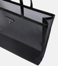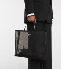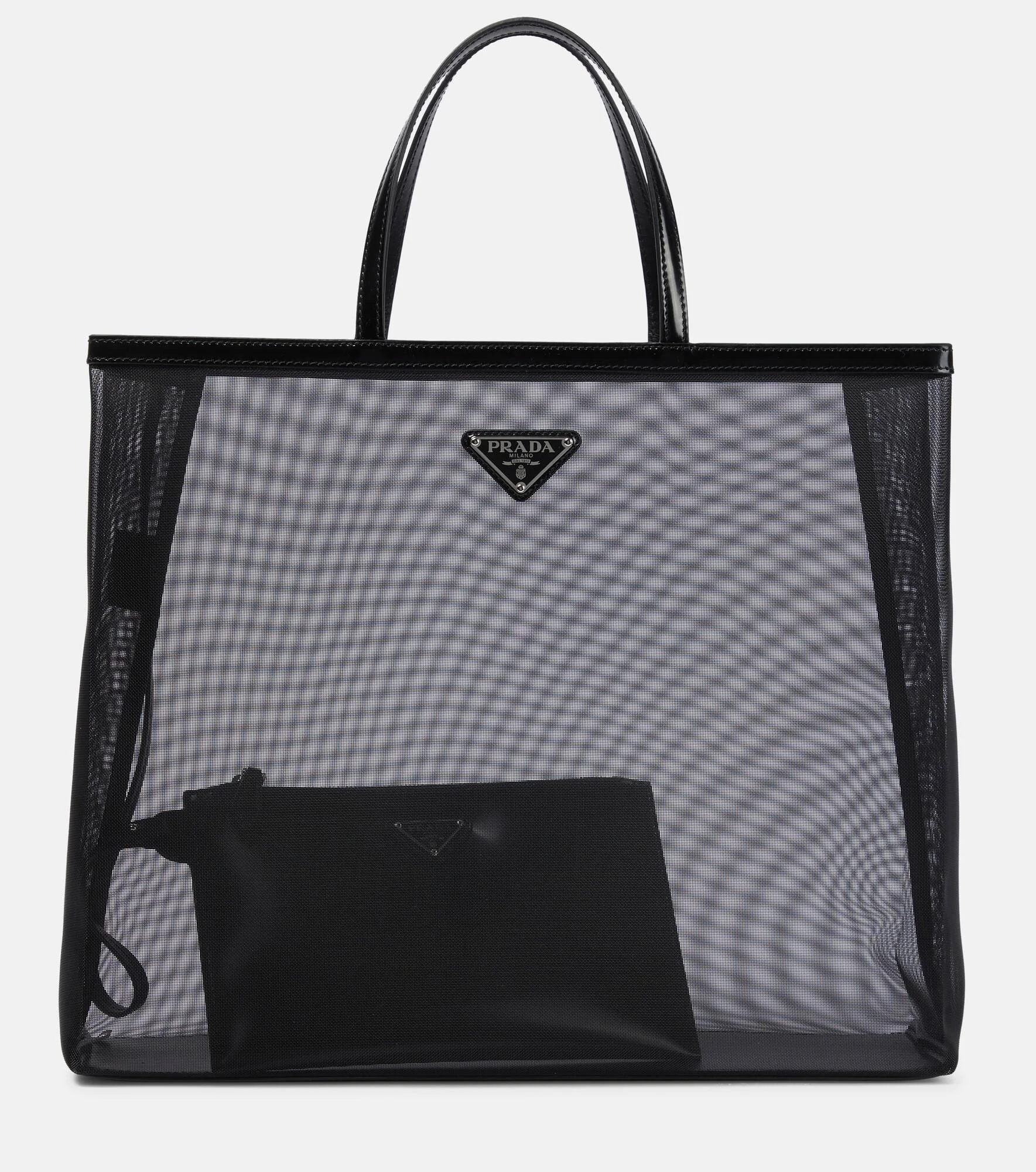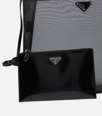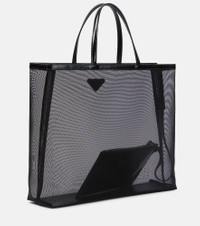 Flaunt what you bought with this large mesh tote from Prada. The translucent mesh allows for easy access to your belongings, while the removable zipped pouch will store your essentials. Made with leather handles and trim, this bag is finished with the brand's signature triangle logo. Product Details - Trim: calf leather - Designer color name: Nero - Internal details: fabric lining, leather lining - Made in Italy - Comes with dust bag - Top handles - Closure: open top - Item number: P00627880 Size & Fit - Height 30cm-12" - Width 36cm-14" - Depth 10cm-4" - Length of handles 33cm-13" - Clutch height 13cm-5" - Clutch width 21cm-8.5"