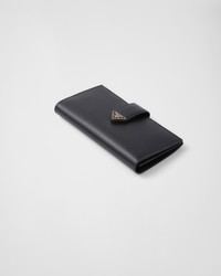 This wallet with snap closure is made of fine leather. The enameled metal triangle logo decorates the accessory. - Product code: 1MV025_2CNP_F0002 - Snap closure - Enameled metal triangle logo - One bill compartment - Nine card slots - Three internal pockets - Zipper coin compartment - Moire and leather lining - Imported Height: 18cm Width: 9cm MATERIALS Main material: Calfskin