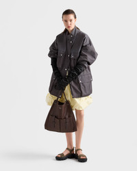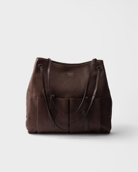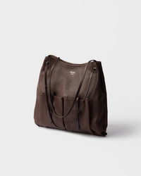 This bag with a soft volume and sleek lines is made of durable, textured leather that gives it a strong, functional character. The roomy silhouette embodies a pragmatic and versatile style, highlighted by utility-style details that enrich the design. - Product code: 1BC289_2G6F_F0324_V_OOO - Sliding leather handles. Maximum drop 53 cm. Minimum drop 35 cm - Front pockets with strap closure - Metal hardware - Printed lettering logo on the front - Canvas interior with zipper pocket - Imported Height: 38cm Width: 40cm MATERIALS Main material: Buffalo