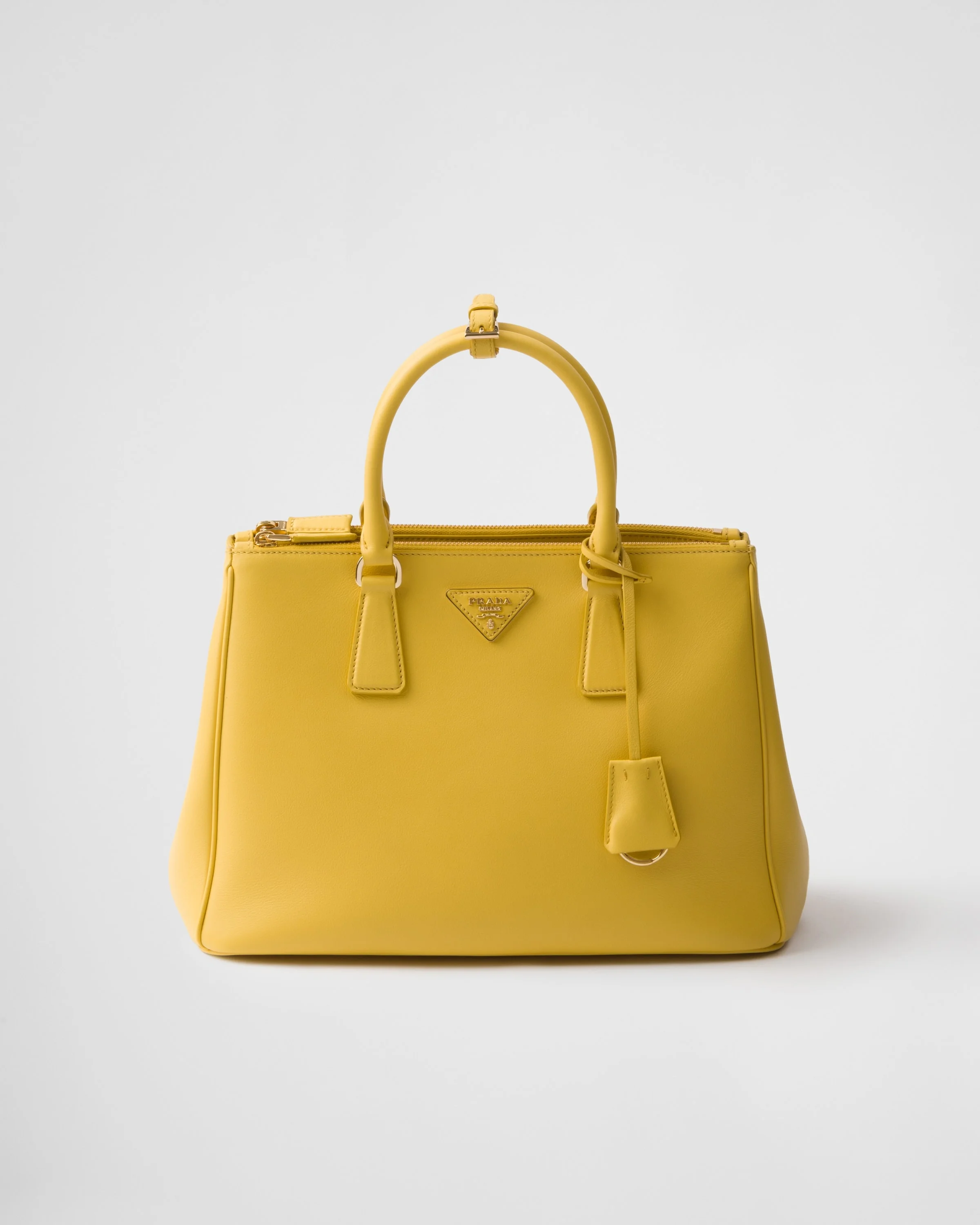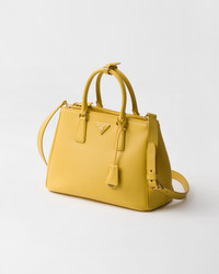 The sophisticated and timeless Prada Galleria bag combines industrial precision and refined, meticulous workmanship that is inherent in the brand's DNA. Composed of over 80 separate pieces assembled by hand, the style celebrates the historic store opened in 1913 in Galleria Vittorio Emanuele II of Milan. The leather accessory, characterized by the iconic three compartments and gold-tone metal hardware, is completed with the emblematic triangle logo. - Product code: 1BA274_2CYS_F0377_V_YO0 - Leather handles - Detachable, adjustable leather shoulder strap Maximum length 120 cm - Minimum length 110 cm - Maximum drop 60 cm- Minimum drop 55 cm - Removable leather key ring - External zipper pockets - Metal hardware - Leather triangle with metal lettering logo on the front - Side snap closure - Nappa leather interior with two pockets, including one with zipper - Leather purse feet - Imported Height: 22.5cm Width: 32cm Length: 13.5cm MATERIALS Main material: Calfskin