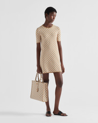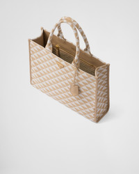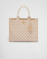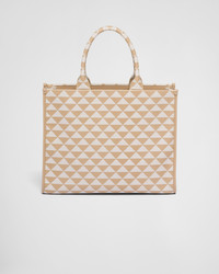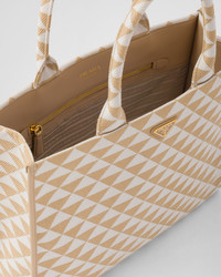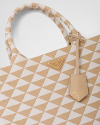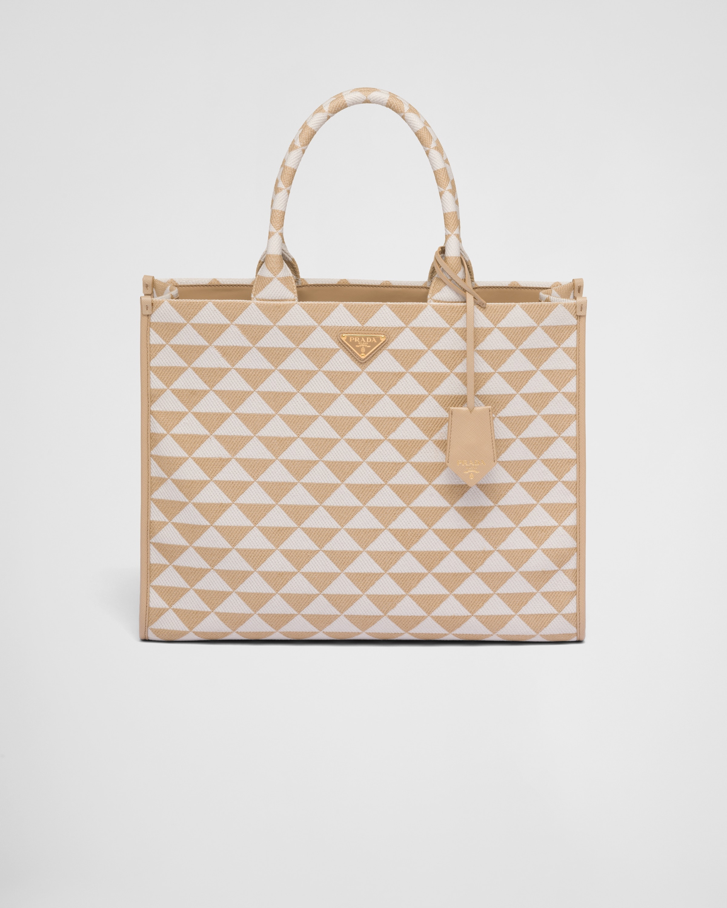 Introduced for the first time on trunks designed by Mario Prada, the Prada triangle expresses uniqueness and modernity through its universal, minimalist shape that is reinvented in a different way each season. Here, the geometric design is transformed into a sophisticated yet modernist pattern that plays with contrasting colors and decorates this sleek tote bag. Details in the brand's iconic Saffiano leather embellish the design. - 商品品番: 1BA356_2FKL_F0J0A_V_OOM - Saffiano leather details - Embroidered fabric handles - Removable leather keychain - Metal hardware - Enameled metal triangle logo on front - Prada logo-print nylon lining with two pockets, one with zipper - インポート 高さ: 31cm 幅: 39cm マチ: 11cm MATERIALS Fabric/Leather