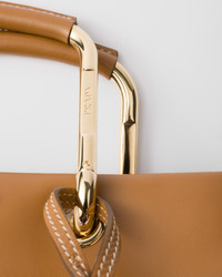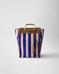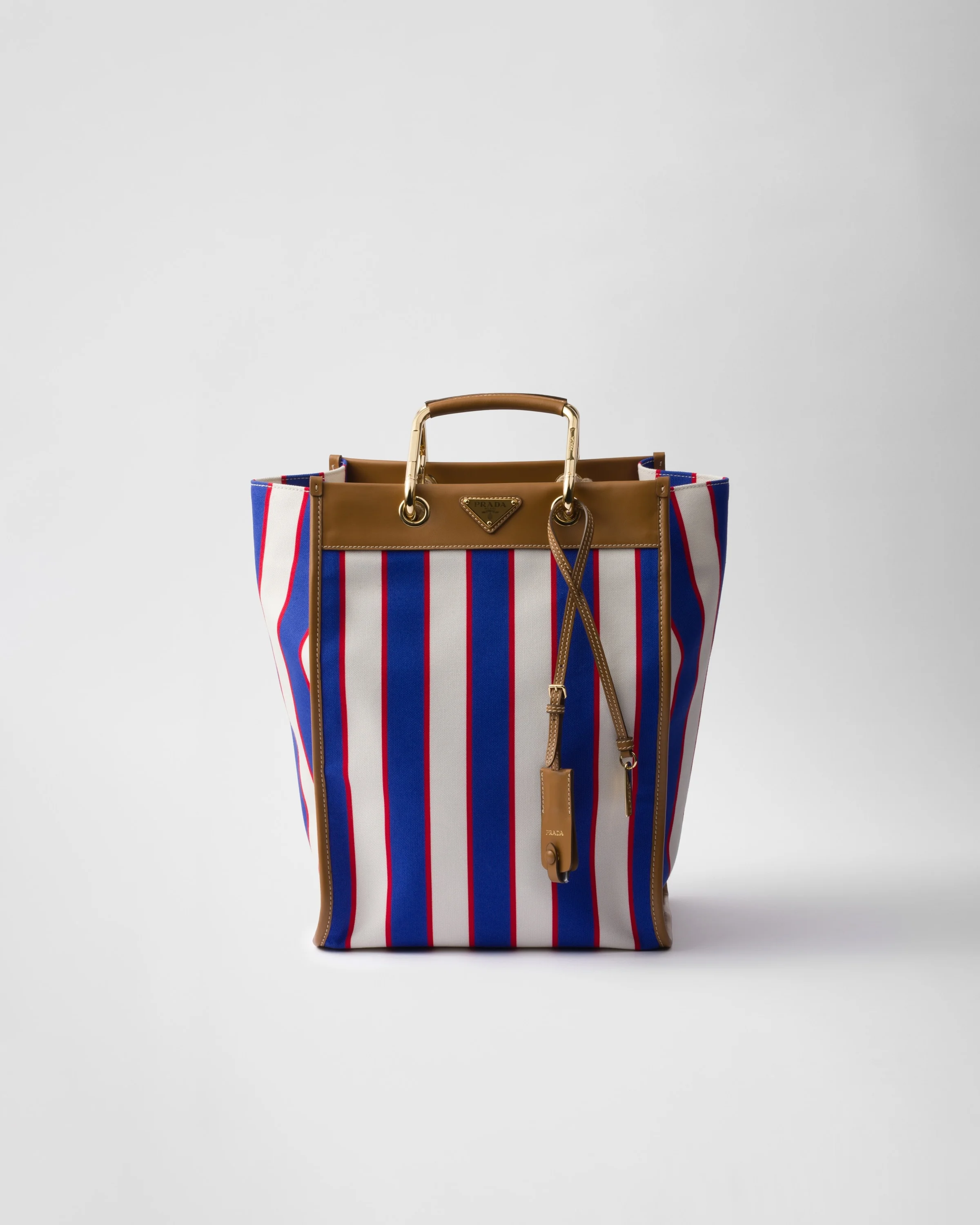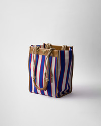 Retro summer moods and refined artisanal touches merge in the design of this canvas tote embellished with a stripe motif. Leather details enrich the versatile and sophisticated design decorated with the enameled metal triangle logo. - Product code: 1BG561_2HHM_F04H7_V_OOO - Double metal and cord handles, drop 35 - Removable leather mirror - Metal hardware - Enameled metal triangle logo on the front - Interior in linen blend fabric with two pockets, including one with zipper - Imported Height: 35cm Width: 26cm Length: 17cm MATERIALS Main material: Cotton