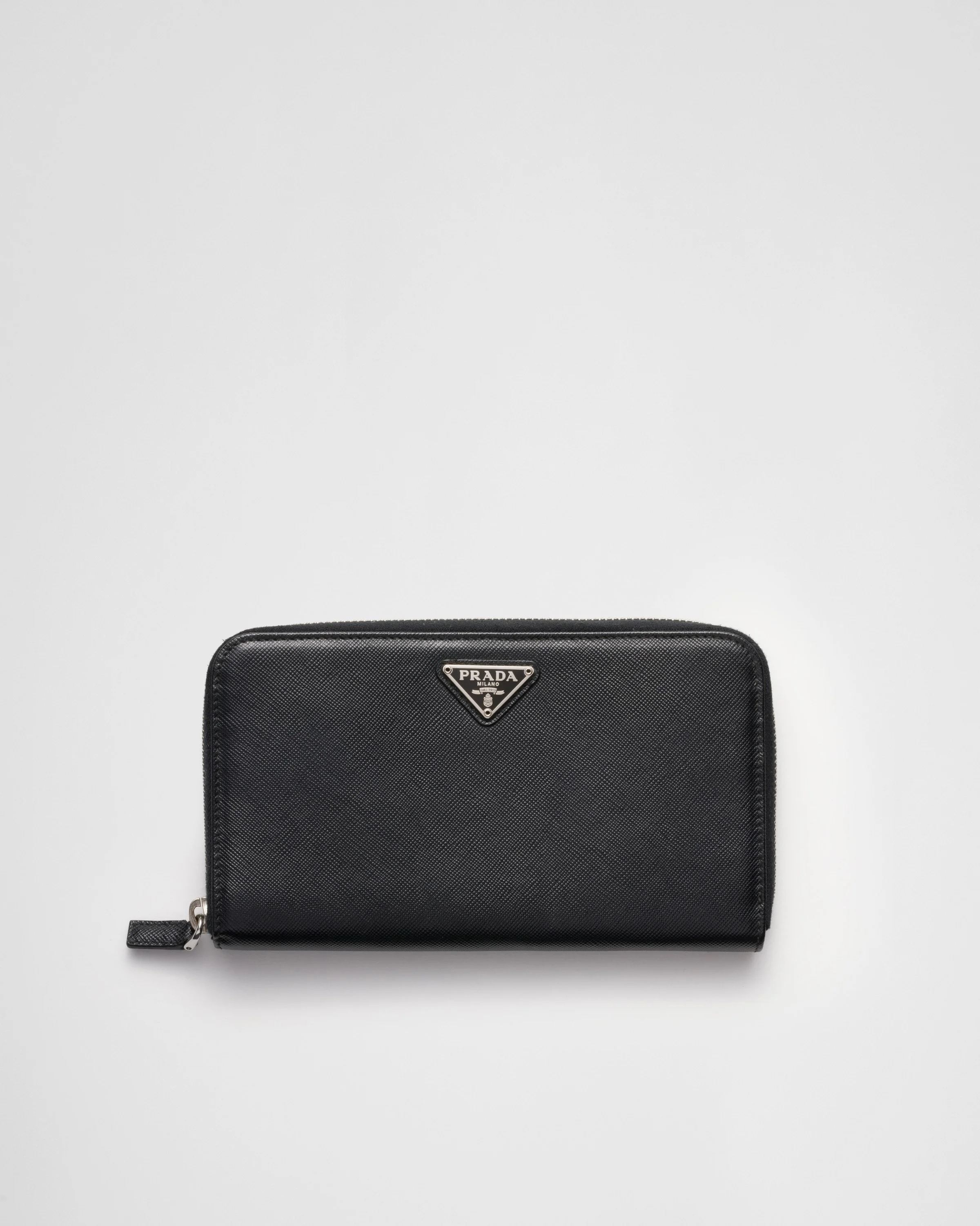 A curved-edged Saffiano leather wallet containing 1 bill compartment with zipper, 12 credit card slots, 6 document pockets and 1 coin compartment with zipper. The piece is finished with the Prada logo and zipper closure. - Product code: 1ML506_QHH_F0632 - Zipper closure - Enameled metal triangle logo - Two bill compartments - Twelve card slots - Two internal pockets - Internal coin pocket with zipper - Moire and Saffiano leather lining - Imported Height: 10.3cm Width: 20cm MATERIALS Main material: Calfskin