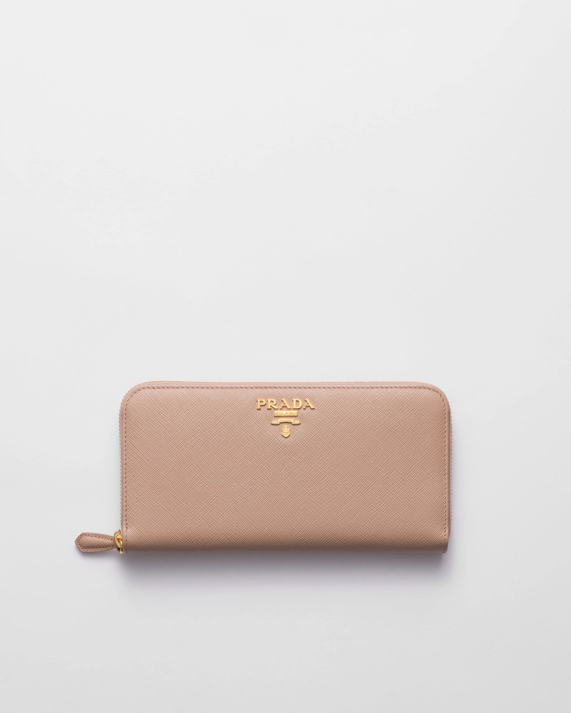 This Saffiano leather wallet is decorated with Prada lettering. The all-round zipper reveals plenty of card slots, pockets and a zippered compartment for coins. - Product code: 1ML506_QWA_F0236 - Zipper closure - Metal lettering logo - Two bill compartments - Twelve card slots - Two internal pockets - Internal coin pocket with zipper - Moire and Saffiano leather lining - Imported Height: 10.3cm Width: 20cm MATERIALS Main material: Calfskin