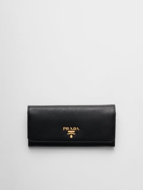 A Saffiano leather flap wallet with gold-finish Prada lettering. The monotone exterior hides multi-colored leather lining inside, as well as various compartments and pockets. - Product code: 1MH132_ZLP_F0G28 - Multicolored Saffiano leather lining - Snap closure - Metal lettering logo - Two bill compartments - Ten card slots - Four interior pockets - Internal coin pocket with zipper - External zipper pocket - Moire and Saffiano leather lining - Imported Height: 9.5cm Width: 18.7cm MATERIALS Main material: Calfskin