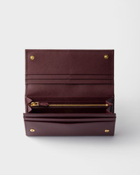 Decorated with the triangle Prada logo, this flap wallet is crafted in Saffiano leather. The snap closure opens to various card slots and pockets. - Product code: 1MH132_QHH_F0007 - Snap closure - Enameled metal triangle logo - Two bill compartments - Ten card slots - Four interior pockets - Internal coin pocket with zipper - External coin pocket with zipper - Moire and Saffiano leather lining - Imported Height: 9.5cm Width: 18.7cm MATERIALS Main material: Calfskin
