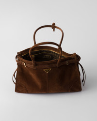 Pragmatic, contemporary elegance defines this suede handbag. The roomy and versatile design is enriched by elegant straps that enhance the refined simplicity of the style. - Product code: 1BA433_2C4S_F0324_V_MOO - Leather handles, drop 22 cm - Detachable, adjustable shoulder strap. Maximum length 120 cm - Minimum length 100 cm - Maximum drop 60 cm- Minimum drop 50 cm - Metal hardware - Enameled metal triangle logo on the front - Zipper closure - Nappa leather and logo-print nylon lining with zipper pocket - Imported Height: 24cm Width: 38cm Length: 12cm MATERIALS Main material: Calfskin