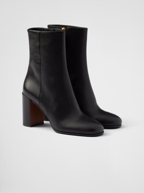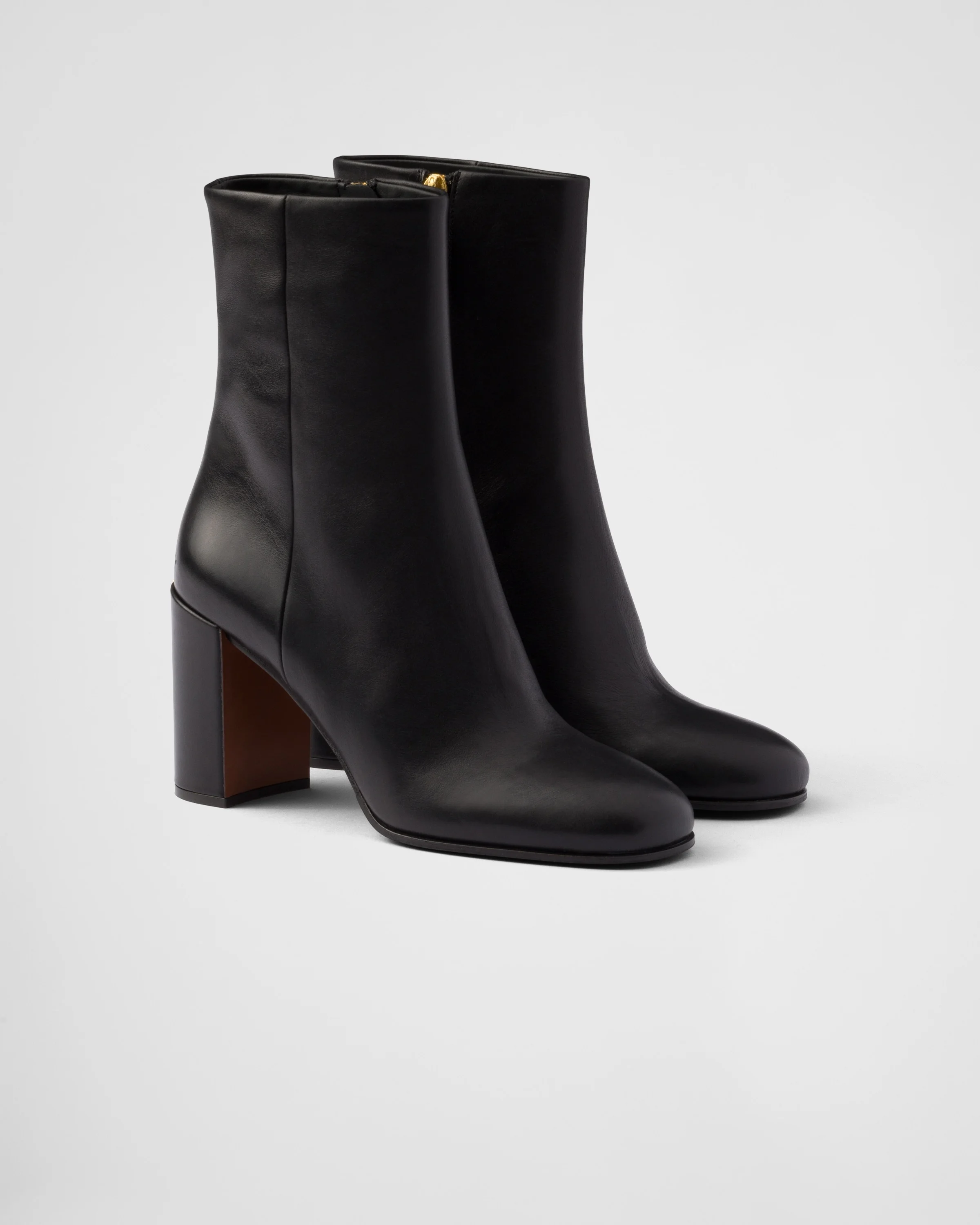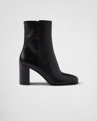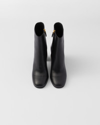 These leather booties have a sleek, refined design and a versatile character. - Product code: 1T631N_070_F0002_F_085 - Leather lining - Side zipper closure - Boot leg: 16 cm - Leather and rubber sole with hot-stamped logo - Leather-covered heel with enameled metal triangle logo, height 85 mm - Imported MATERIALS Main material: Calfskin