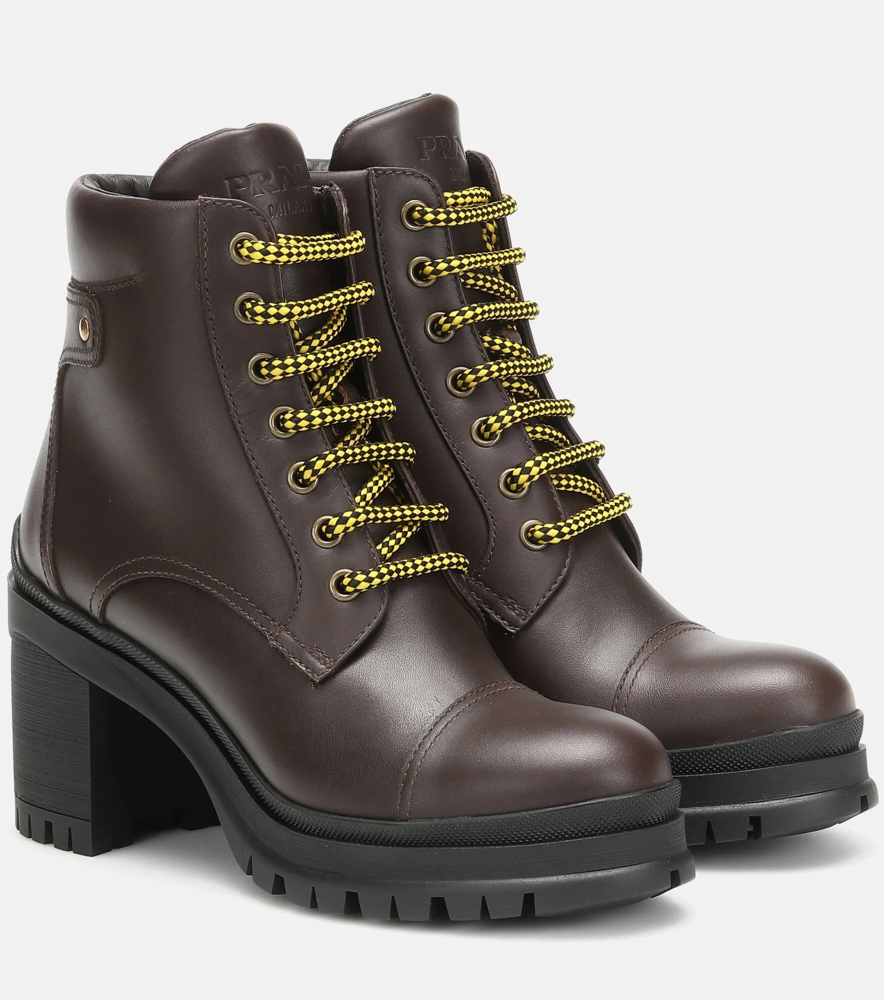 These burgundy leather ankle boots from Prada are a feminine take on workwear codes. Threaded with yellow and black-checked laces, they’re crafted in Italy with paneled toe caps and set on exaggerated block heels with chunky rubber tread soles. Wear them with an oversized jacket and form-fitting top to play with proportions. Product Details - Lining: leather - Sole: leather insole, rubber sole - Toe shape: round toe - Upper: leather - Closure: lace-up - Designer color name: Bruciato - Made in Italy - Item number: P00404317 Size & Fit - Fits slightly large to size - we recommend trying a half size smaller - European sizes - 8,5cm-3.5" heel (size EU 38) - 2cm-1" platform (size EU 38)