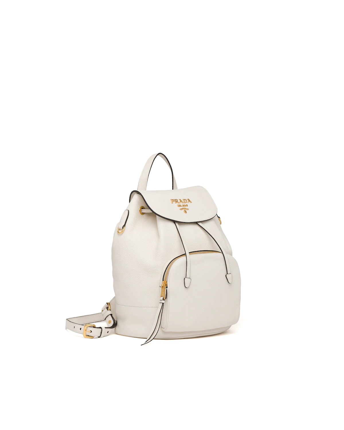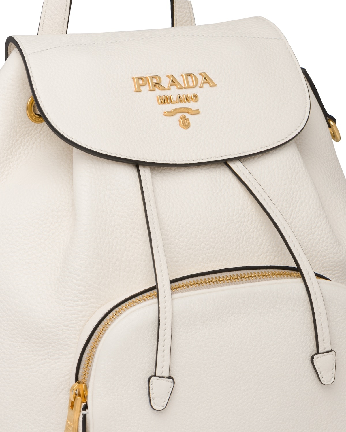 This roomy leather backpack is decorated with the metal logo. The leather straps are detachable and adjustable. - Calf leather - Leather handle - Two detachable adjustable leather straps - Flap closure with leather drawstring - Two inside pockets, including one with zipper - Front zipper pocket - Prada logo nylon lining - Metal logo 31 cm Height 24 cm Width Composition Leather