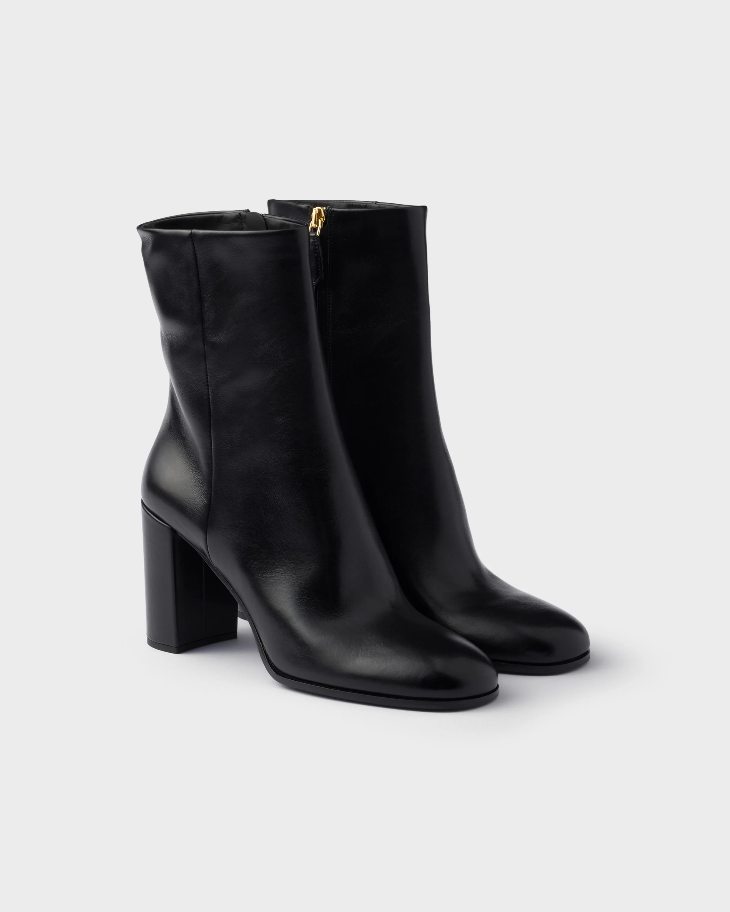 These leather booties have a sleek, refined design and a versatile character. - Product code: 1T631N_070_F0002_F_B085 - Leather lining - Side zipper closure - Boot leg: 16 cm - Leather and rubber sole with hot-stamped logo - Leather-covered heel with enameled metal triangle logo, height 85 mm - Imported MATERIALS Main material: Calfskin