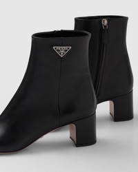 These leather booties with side zipper and leather lining have a sleek design. The iconic triangle logo, which first appeared on trunks designed by Mario Prada in 1913, decorates the footwear. - 商品代號: 1T192N_07I_F0002_F_055 - Leather lining - Enameled metal triangle logo - Side zipper closure - 14 cm boot leg - Leather sole - Metal lettering logo - 55 mm leather-covered heel - 進口 MATERIALS Leather