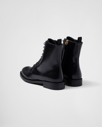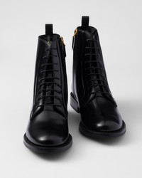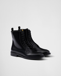 These ankle boots have a refined silhouette crafted from brushed leather that complements the functional yet polished style, elevated by minimalistic details. - Product code: 1T854N_055_F0002_F_025 - Upper with waxed strings and pull tab on the back - Leather lining - Screen-printed logo - Side zipper fastening - 14 cm boot leg - Monoblock rubber sole with hot-stamoed logo - Heel height: 25 mm - Leather welt with stitching - Imported MATERIALS Main material: Calfskin