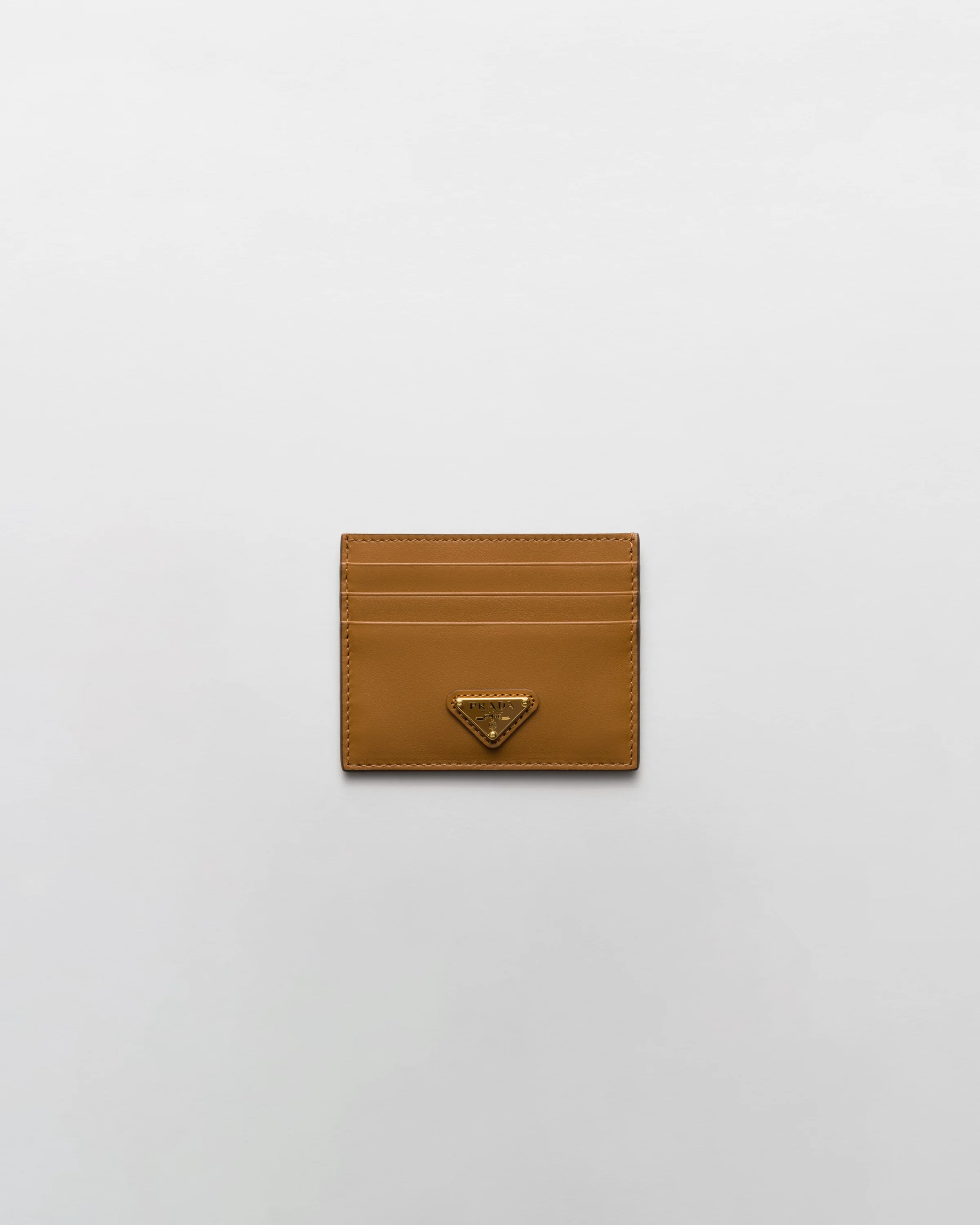 This leather card holder with six external slots and a practical internal pocket has a sleek and sophisticated design. The accessory is completed by the iconic signature of the enameled metal triangle logo. - Product code: 1MC025_2CNP_F03BH - Enameled metal triangle logo - Six card slots - One internal pocket - Imported Height: 8cm Width: 10cm MATERIALS Main material: Calfskin
