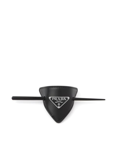 This leather hair clip is decorated with the Prada logo. - Product code: 1IF004_8NQ_F0JYM - Leather - Enameled metal triangle logo - Plexiglas pin - Imported MATERIALS Main material: Calfskin
