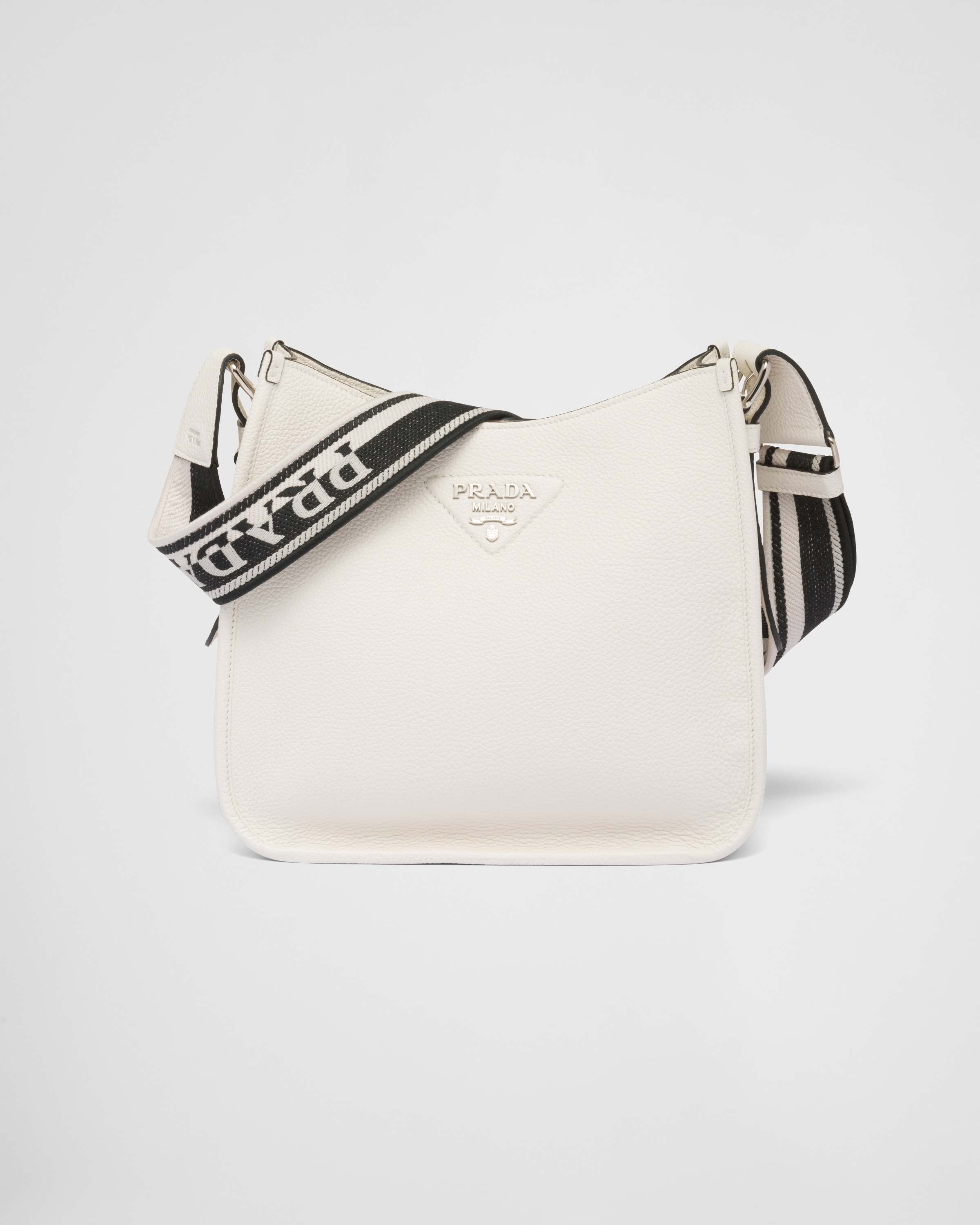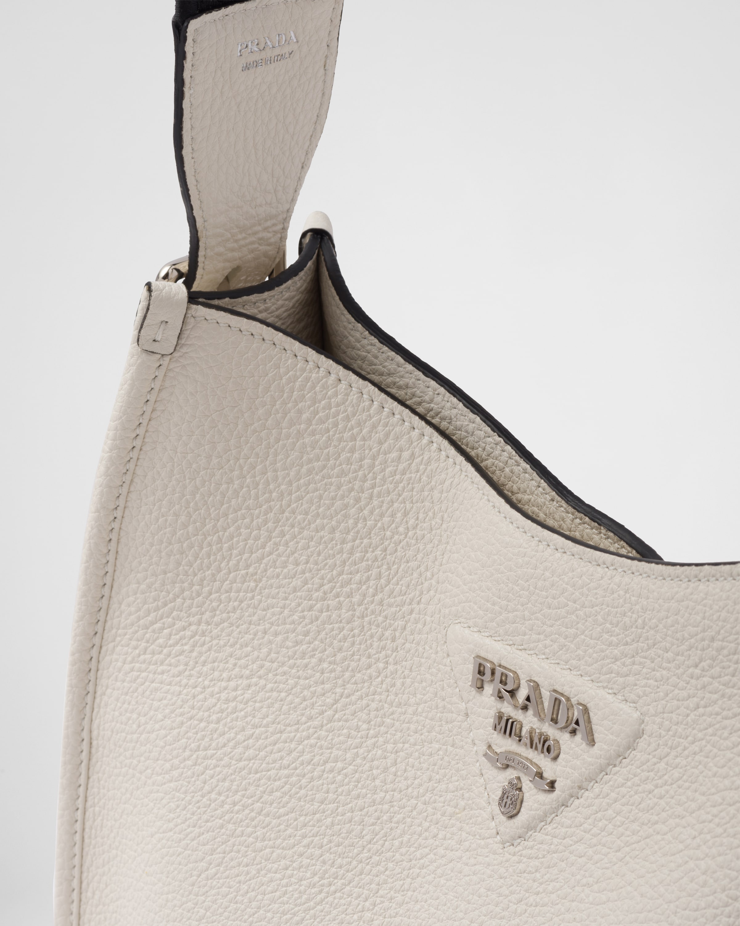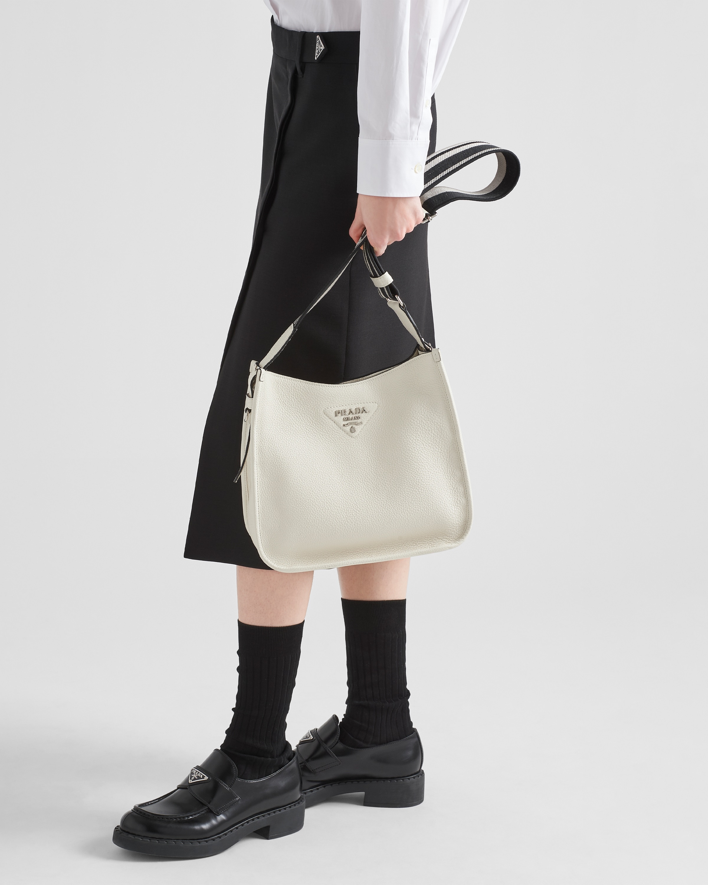 This soft leather hobo bag expresses modern elegance and is decorated on the front by the metal lettering logo. The adjustable embroidered logo-print woven tape shoulder strap adds a sporty note. - 商品货号: 1BC073_2DKV_F0009_V_FOO - Adjustable 70 cm embroidered logo-print woven tape shoulder strap - Metal hardware - Metal lettering logo on the front - Magnetic closure - Logo-print nylon lining with two pockets, including one with zipper - 产品标签信息 高度: 26cm 宽度: 28cm 长度: 11cm MATERIALS Leather