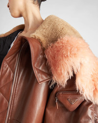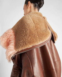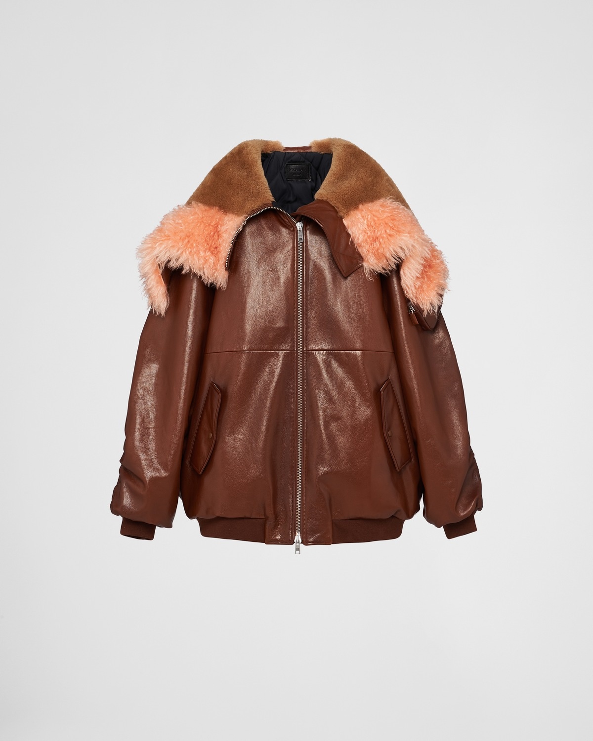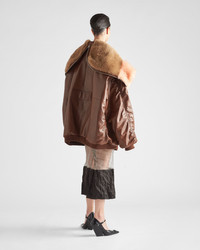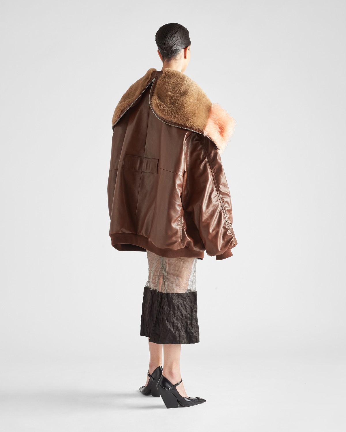 For the FW22 collection, traditions collide in unexpected ways, with inverted and contrasting materials and garments. Typical menswear pieces are transformed with feminine elements. This oversized leather jacket comes with a shearling-lined zipper hood trimmed with Aspen for a soft effect with delicate color contrasts. Menswear silhouettes are combined with unexpected materials and textures that reinvent the style. - Product code: 56A058_11KD_F0005_S_222 - Quilted lining - Padding with wadding - Oversized fit - Front zipper closure - Zipper hood - Anatomical sleeve and ribbed knit cuffs - Flap pockets - With belt - Ribbed knit trim on the hem - Shearling-lined hood with Aspen trim - Height: 85cm MATERIALS Leather