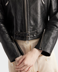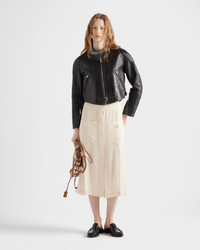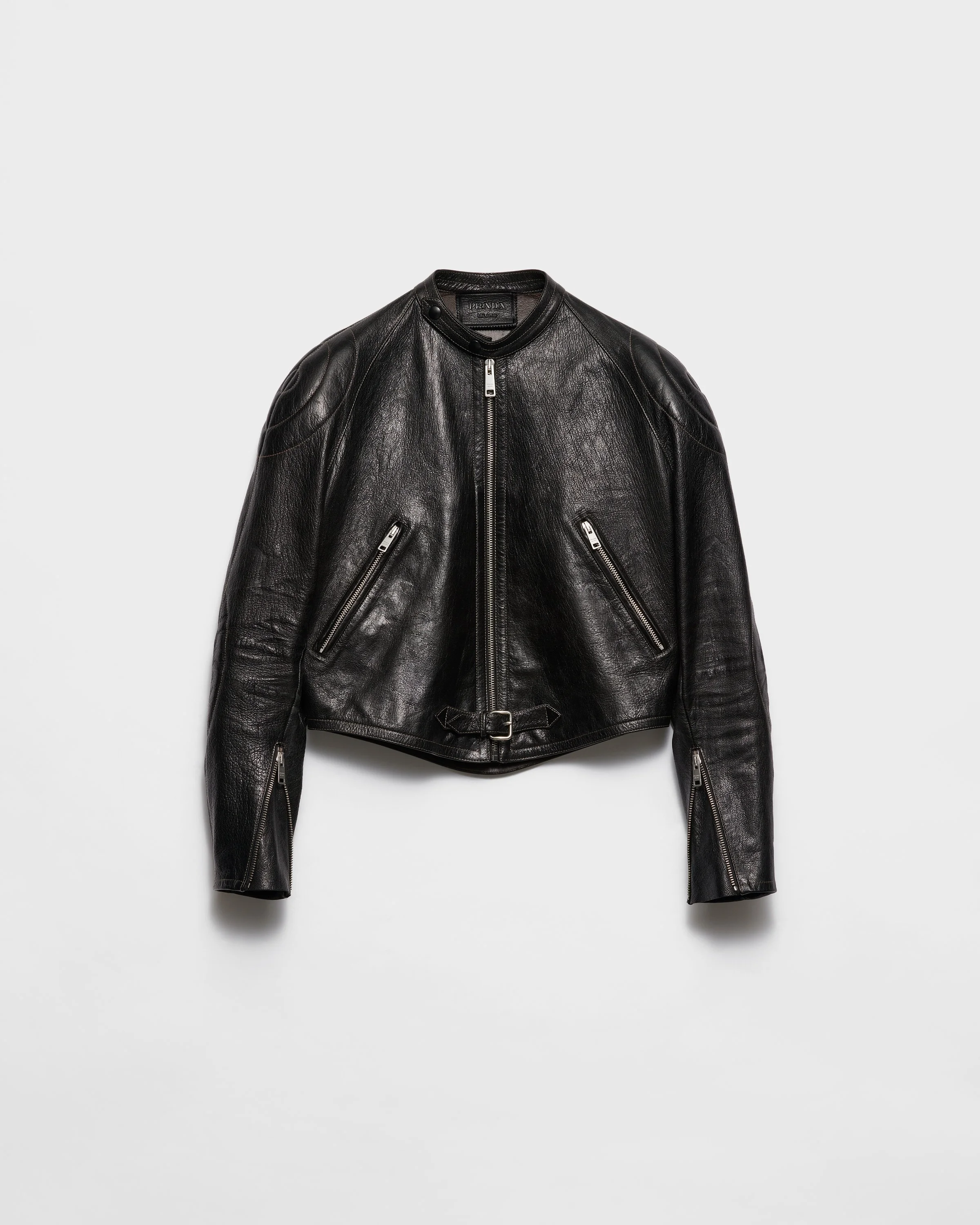 The biker jacket is reinterpreted with a rounded silhouette, enhanced by hand-treated leather for a vintage finish. Top-stitching outlines the jacket with bold style, completed with a band collar and refined notes with vintage allure. - Product code: 58A228_16IN_F0002_S_OOO - Unlined garment - Regular fit - Center zipper closure - Raglan sleeves and zippered cuffs - Welt zipper pockets - Leather triangle logo on the back - Vintage treatment - Snap closure on the neck - Imported - The model is 176 cm tall and wears a size 38 Height: 54cm MATERIALS Main material: Goatskin