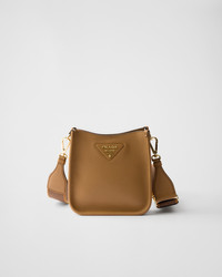 This versatile leather bag boasts a sleek and functional design. The shoulder strap adds a sporty element to the accessory, elevated by the metal logo lettering that stands out on the simple yet distinctive geometry of the iconic triangle. - Product code: 1BH191_2DKV_F03V8_V_7NO - Adjustable and detachable logo-print woven tape shoulder strap, length 95 cm. Maximum length 107 cm - Minimum length 56 cm - Maximum drop 60 cm - Minimum drop 40 cm - Detachable, adjustable leather shoulder strap, length: 100 cm - Metal hardware - Metal lettering logo on the front - Magnetic flap closure - Logo-print nylon lining with card slots - Imported Height: 20cm Width: 19cm Length: 6cm MATERIALS Main material: Calfskin