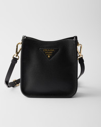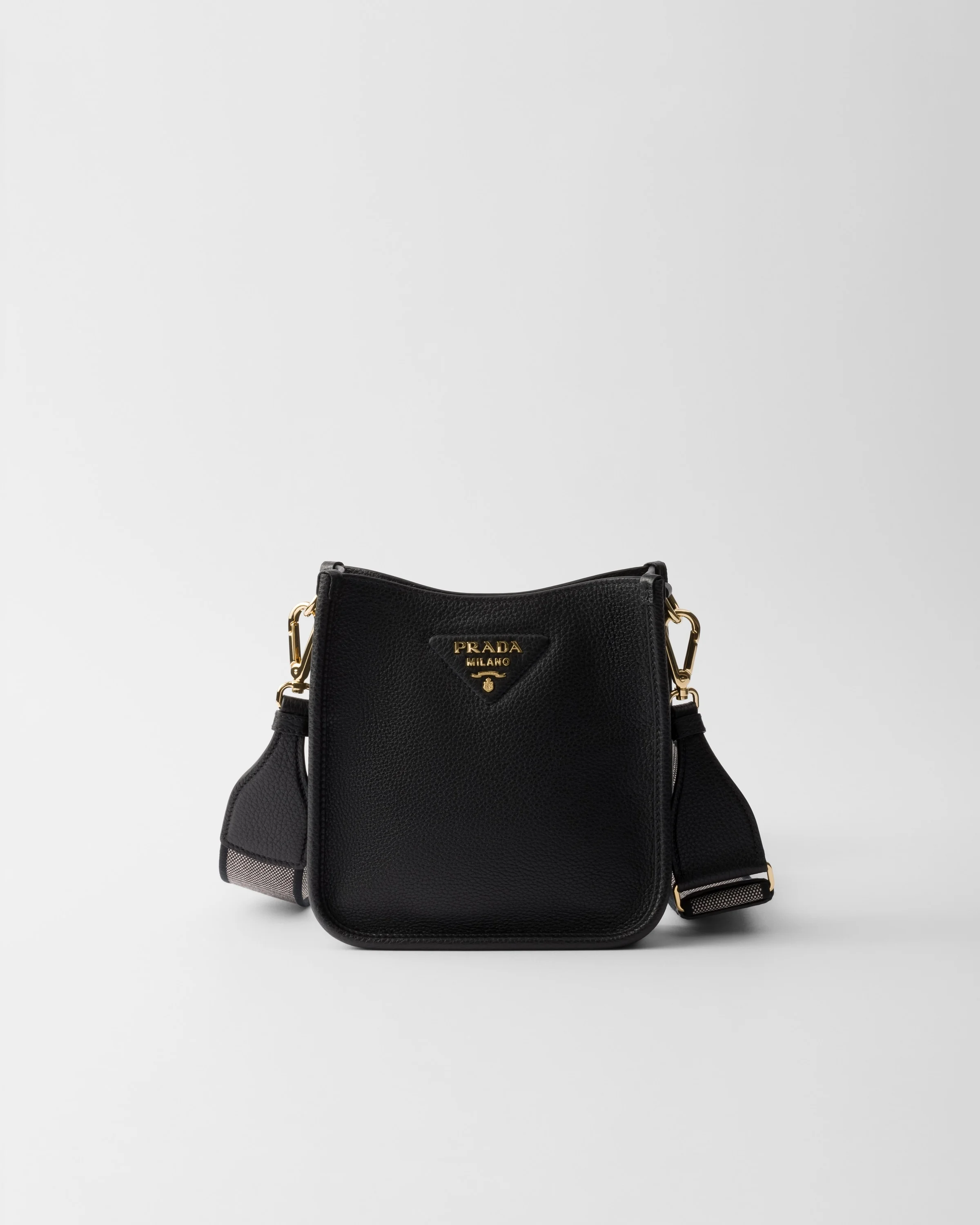 This versatile leather bag boasts a sleek and functional design. The shoulder strap adds a sporty element to the accessory, elevated by the metal logo lettering that stands out on the simple yet distinctive geometry of the iconic triangle. - Product code: 1BH191_2DKV_F0632_V_7NO - Adjustable and detachable logo-print woven tape shoulder strap, length 95 cm. Maximum length 107 cm - Minimum length 56 cm - Maximum drop 60 cm - Minimum drop 40 cm - Detachable, adjustable leather shoulder strap, length: 100 cm - Metal hardware - Metal lettering logo on the front - Magnetic flap closure - Logo-print nylon lining with card slots - Imported Height: 20cm Width: 19cm Length: 6cm MATERIALS Main material: Calfskin