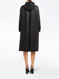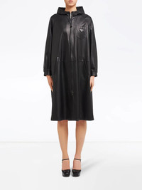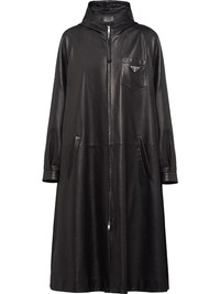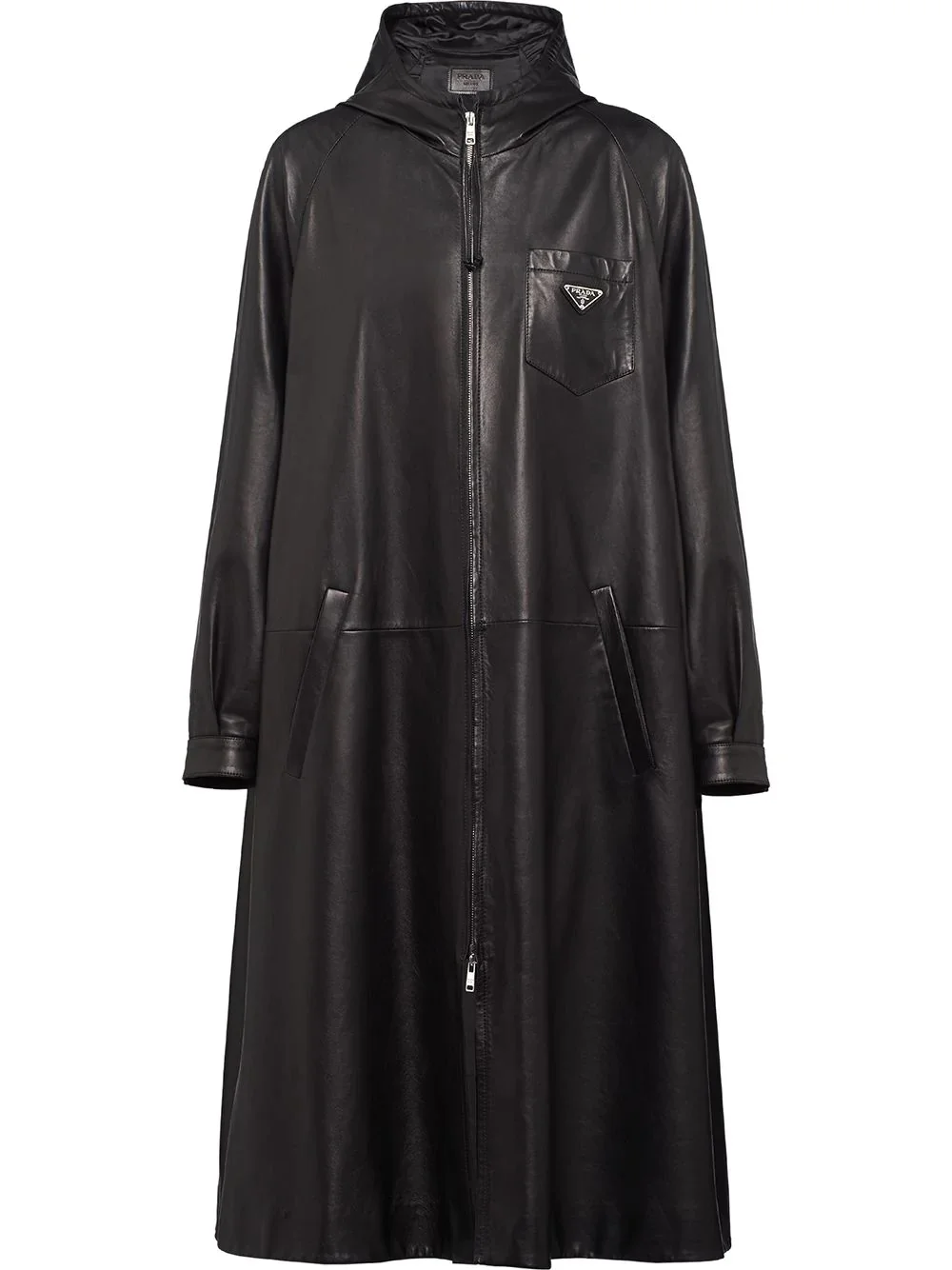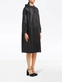 leather oversized trench coat Think you're too cool for school? We agree, but this leather oversized trench coat from Prada can still teach you a thing or two about streetstyle. Take notes. Highlights - Black - Lambskin - Drawstring hood - Front zip fastening - Enamel triangle logo - Chest patch pocket - Two diagonal pockets to the sides - Buttoned cuffs - Straight hem Composition Lining: Viscose 100% Outer: Lambskin 100%
