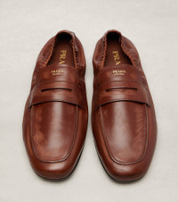 Prada takes Italian heritage into a distinctly modern direction with a streamlined and fashion-forward approach. Expertly crafted from smooth leather, these penny loafers are complete with elasticated detailing at the heels for added comfort. Product Details - Upper: leather - Lining: leather - Sole: leather insole, rubber sole - Toe shape: square toe - Made in Italy - Includes: shoe box - Designer color name: Brown - Item color: brown - Item number: P01096432 Size & Fit - True to size - Slightly narrow at the back - European sizes - 1,5cm-0.5" heel (size EU 38)