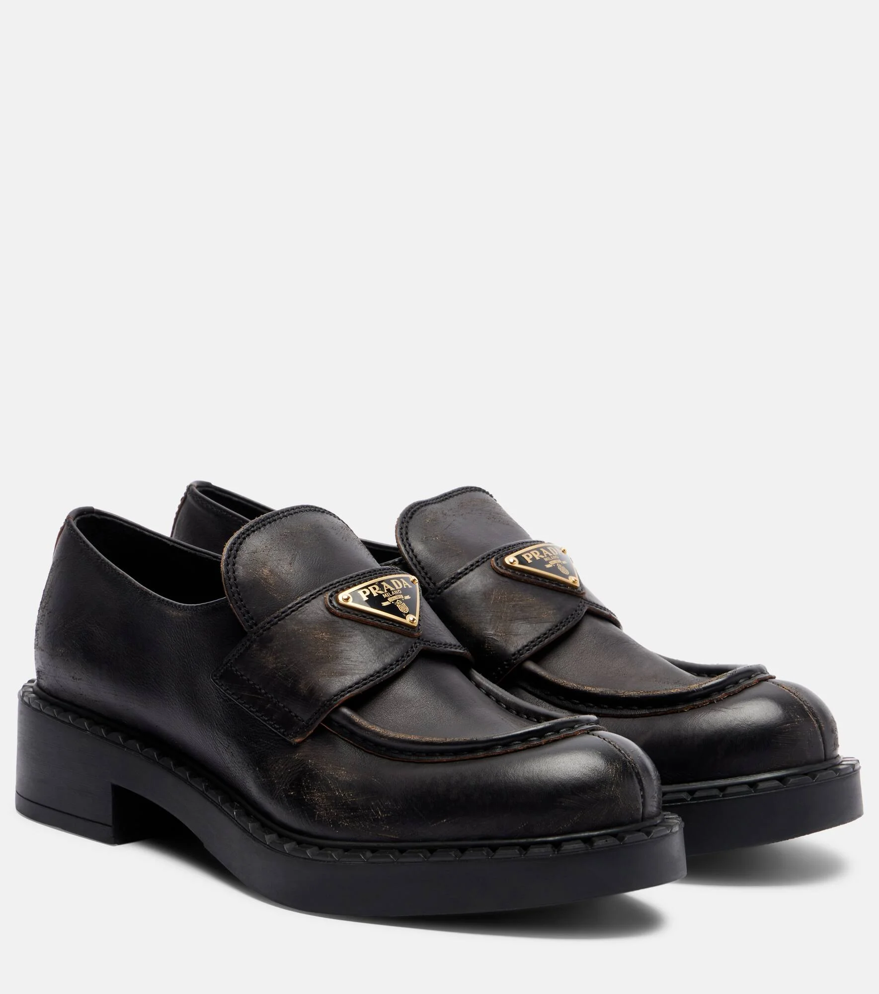 Instantly recognizable, the triangle has stood as Prada's enduring emblem since 1913. The signature logo is showcased on these penny loafers, made in Italy from leather with an antiqued finish. Product Details - Upper: calf leather - Lining: leather - Sole: leather insole, rubber sole - Color: black - Toe shape: round toe - Made in Italy - Includes: shoe box, dust bag - Designer color name: Nero - Item color: black - Item number: P01139949