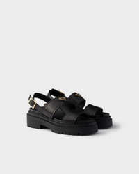 Sporty style and artisan refinement are combined in the design of these leather sandals. The footwear is defined by chunky soles that give it a versatile and distinctive character and is decorated with the iconic triangle logo. - Product code: 1X104O_7V6_F0002_F_055 - Upper with heel strap and metal buckle - Enameled metal triangle logo - Rubber monoblock sole, 55 mm, with lug tread and hot-stamped logo - Notched-effect double welt - Imported MATERIALS Main material: Calfskin