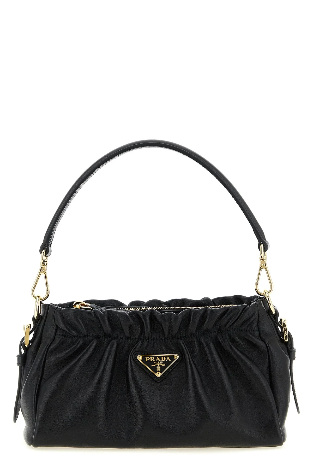 cod. 1BC270VOOO2DX8F0002 Curled leather shoulder bag, front enameled metal triangle logo, top zip closure, removable handle, monogram fabric lining, adjustable and removable shoulder strap. Color: Black Size & Fit: W 23 x H 13.5 x D 10 cm Composition: 100% lamb leather (Ovis aries) Made in: Italy
