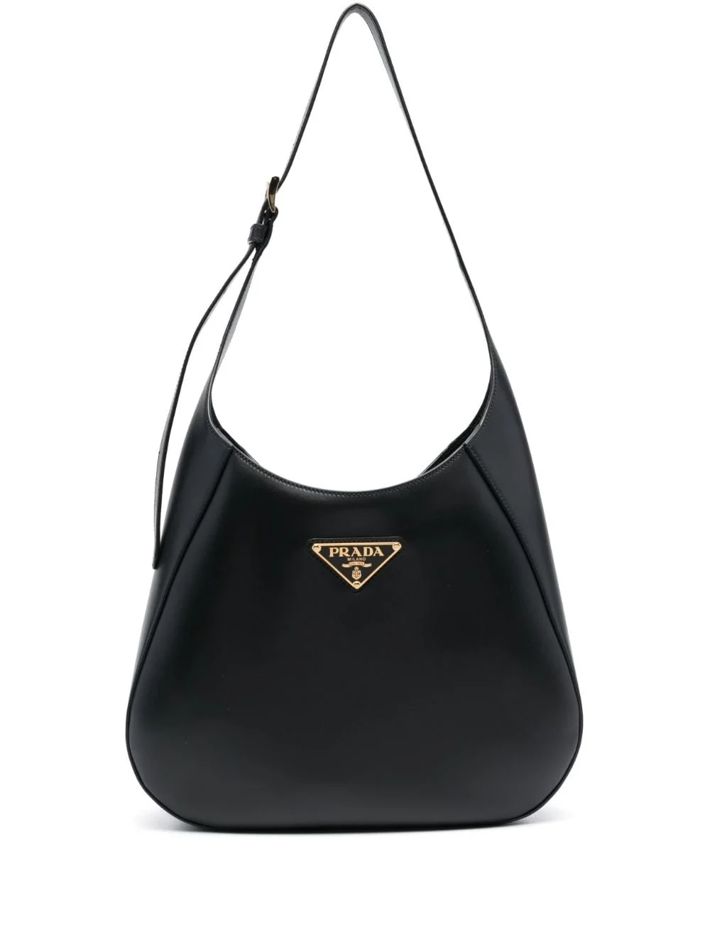 triangle-logo leather shoulder bag Italian-made, Prada's sleek crossbody bag is fabricated from black leather with complementary gold-tone hardware. Detailed with a triangle logo plaque to the front, the accessory honours one of the label’s most recognisable symbols. Highlights - Black - Calf leather - Triangle logo - Curve-edge body - Adjustable top handle - Main compartment - Internal logo stamp Composition Outer: Calf Leather 100% SIZE & FIT Model measurements Height 5 ft 10 in(1.78 m) Bust/Chest 31.49 in(80 cm) Hips 37 in(94 cm) Waist 23.62 in(60 cm) Measurement DEPTH 3.54 in(9 cm) HANDLE 14.17 in(36 cm) HEIGHT 8.66 in(22 cm) WIDTH 11.81 in(30 cm)
