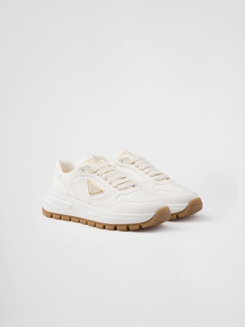 These leather sneakers with a sporty silhouette and pragmatic, modern design are characterized by a comfortable rubber sole. The shoe decorated with different interpretations of the Prada logo is completed by the distinctive touch of the iconic enameled metal triangle logo. - Product code: 1E804M_038_F0632_F_B045 - Leather lining - Enameled metal triangle logo - Closure with polyester laces - Rubber sole: 45 mm - Removable leather-covered insole - Imported MATERIALS Main material: Lambskin