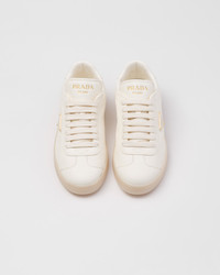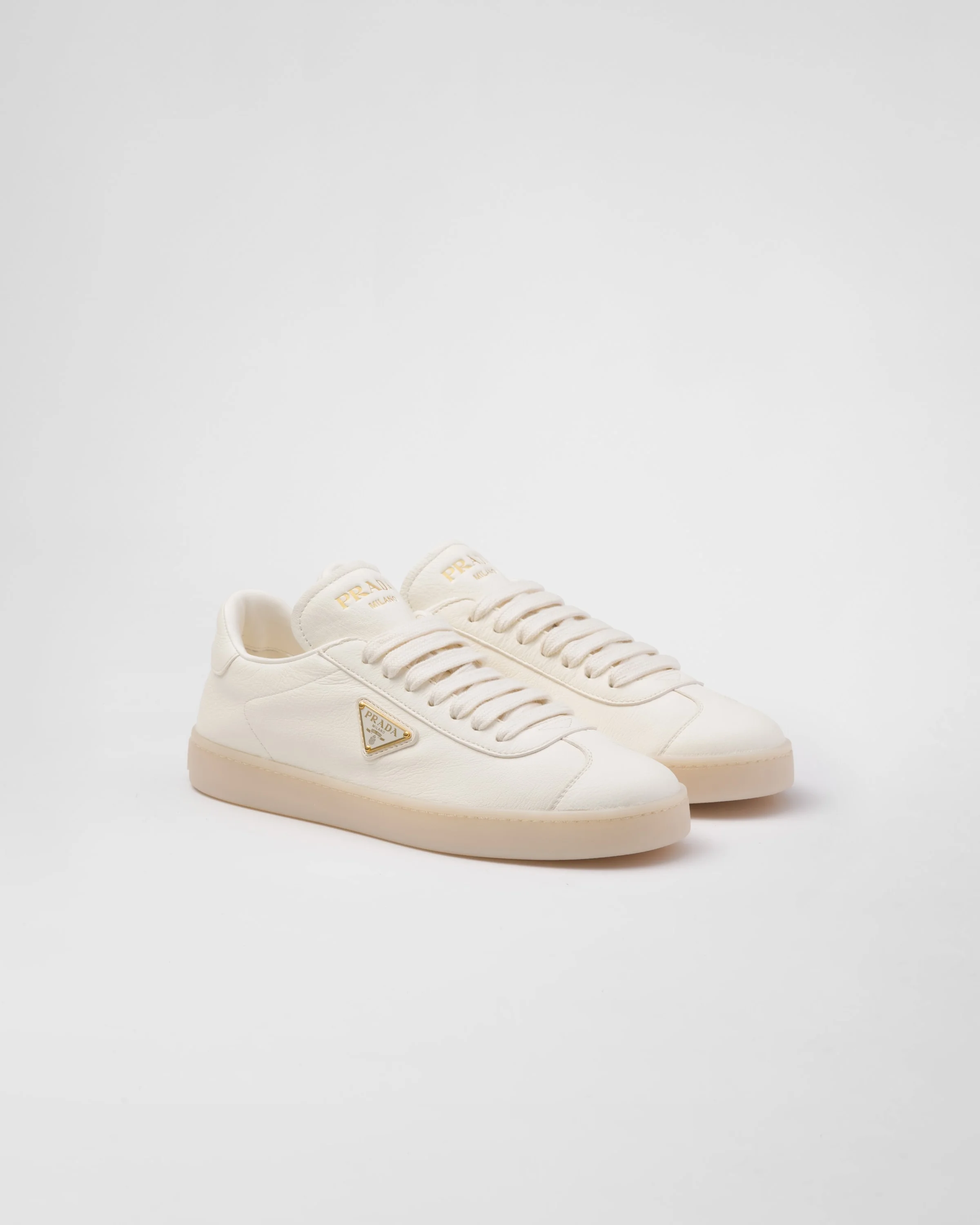 Minimalism and a sporty attitude come together in the sleek design of these leather sneakers. The style with clean lines characterized by a classic closure with cotton laces and light rubber sole is enhanced with the iconic signature touch of the enameled metal triangle logo. - Product code: 1E413N_013_F0304_F_025 - Leather lining - Enameled metal triangle logo - Flat cotton laces - Rubber sole, height 25 mm - Removable leather-covered insole - Imported MATERIALS Main material: Buckskin