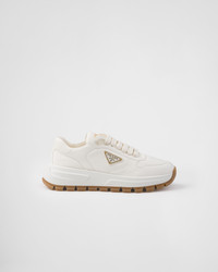 These leather sneakers with a sporty silhouette and pragmatic, modern design are characterized by a comfortable rubber sole. The shoe decorated with different interpretations of the Prada logo is completed by the distinctive touch of the iconic enameled metal triangle logo. - Product code: 1E804M_038_F0304_F_B045 - Leather lining - Enameled metal triangle logo - Closure with polyester laces - Rubber sole: 45 mm - Removable leather-covered insole - Imported MATERIALS Main material: Lambskin