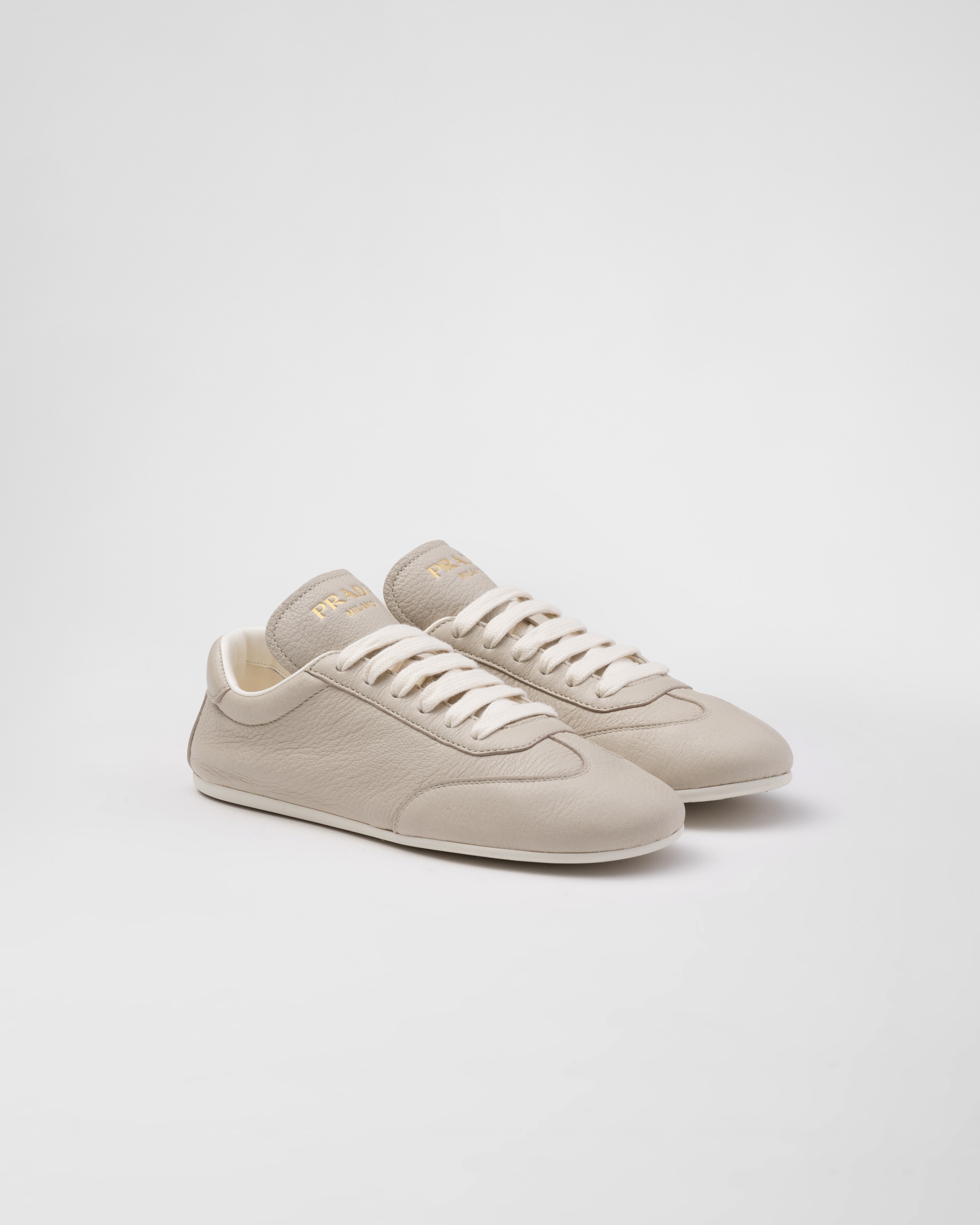 These sleek and refined sneakers combine a sporty inspiration and minimalist lines with contemporary charm. The leather silhouette with a light, thin rubber sole is decorated with the lettering logo embossed on the tongue. - 商品货号: 1E398N_013_F0D32_F_005 - Leather lining - Screen-printed logo on the tongue and heel collar - Closure with cotton laces - Rubber sole, height 05 mm - Tread with geometric pattern - Removable leather-covered insole - 产品标签信息 MATERIALS Leather