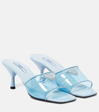 Prada gives a contemporary twist to 90’s style with these PVC mules trimmed with patent leather. This design is made in Italy and has the iconic Triangolo logo embellishment. Product Details - Lining: plastic - Upper: plastic - Trim: cow leather - Sole: leather insole and sole - Comes with extra heel tips - Designer color name: Celeste - Comes with a box - Toe shape: square open toe - Made in Italy - Item number: P00772225 Size & Fit - True to size - European sizes - 7cm-3" heel (size EU 38)