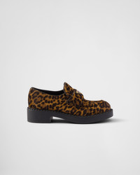 The Chocolate loafers, a reinterpretation of a classic shoe for men, have a chunky design with finely crafted details. The leopard-print leather gives the iconic shoes a new attitude, and the triangle logo completes the style with its distinctive signature. - Product code: 1D246M_XRY_F0151_F_DG50 - Upper with leather band - Enameled metal triangle logo - Monoblock rubber sole, 50 mm, with hot-stamped logo - Rubber welt with notched detail - Imported MATERIALS Main material: Calfskin