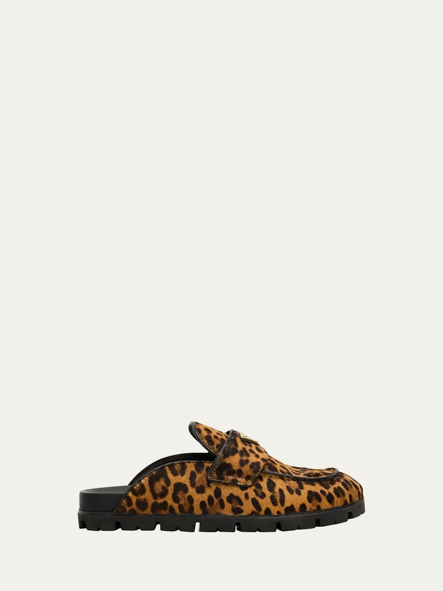 Prada leopardprinted bleached and dyed calf hair (Italy) mules with signature enameled triangle logo accent 0.17 in / 5 mm flat heel Almond moc toe Notched vamp Easy slide style Leather/Rubber outsole Lining: Leather Made in Italy
