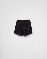 These light shorts with a sporty design and pragmatic character are made of Re-Nylon, the innovative regenerated nylon fabric obtained from recycled plastic materials collected in the ocean. Dynamic lines with a contemporary cut define the oversized silhouette with elasticized waist, completed by the enameled metal triangle logo. For sustainable care to preserve the product's characteristics and reduce microfiber shedding, we recommend not washing the item too often. Let the product air out after every use and have it dry cleaned at a specialized ecological dry cleaners. - Product code: 22X901_1WQ9_F0002_S_WMO - Oversized fit - Unlined - Top-stitched hem - Enameled metal triangle logo - Elasticized drawstring waistband - Waistband with elastic and laced drawstring - Angled motif on the side - Imported - The model is 180 cm tall and wears a size 38 Height: 38cm MATERIALS Main material: 100% recycled polyamide