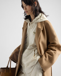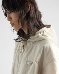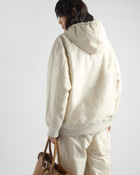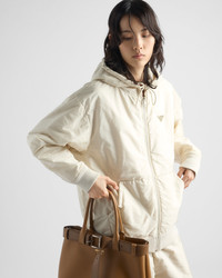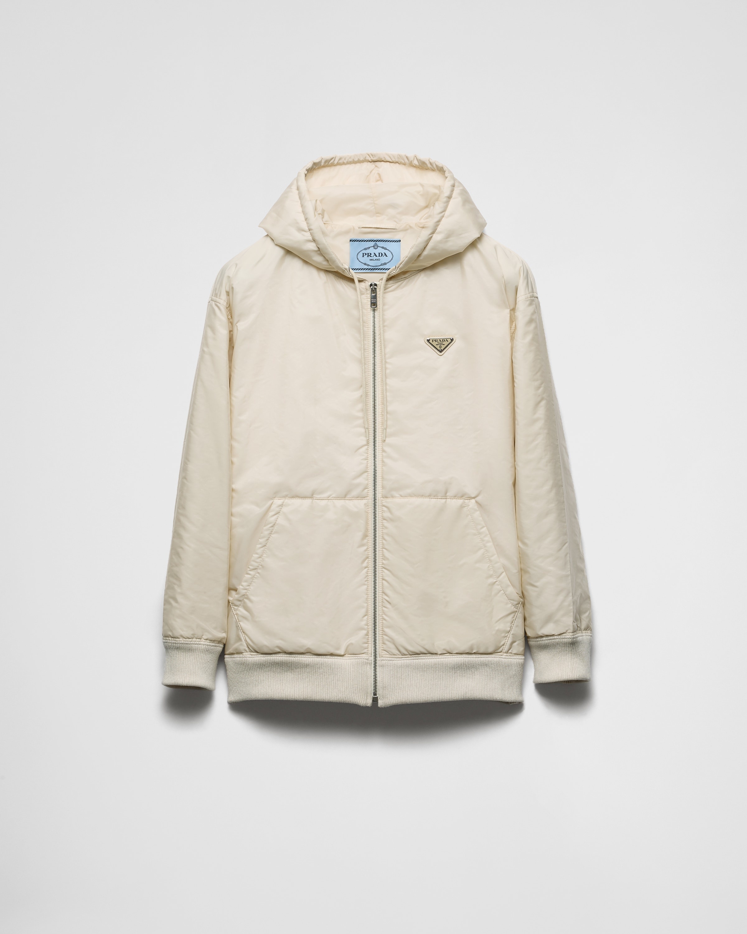 A sporty character and minimalist lines define the silhouette of this hooded blouson jacket made of Re-Nylon, completed with ribbed knit trim and decorated with the iconic triangle logo. For sustainable care to preserve the product's characteristics and reduce microfiber shedding, we recommend not washing the item too often. Let the product air out after every use and have it dry cleaned at a specialized ecological dry cleaners. - Product code: 292212_1WQ9_F0061_S_OOO - Lined - Hood - Long sleeves - Zipper closure - Pouch pockets - Enameled metal triangle logo - Padding with wadding - Ribbed knit cuffs and hem - Regular fit - Pressed garment - The fabric is made of regenerated yarn obtained from recycled plastic materials collected in the ocean. - Imported Height: 60cm MATERIALS Nylon